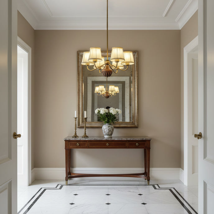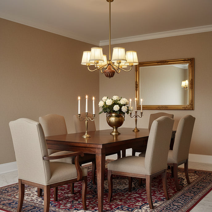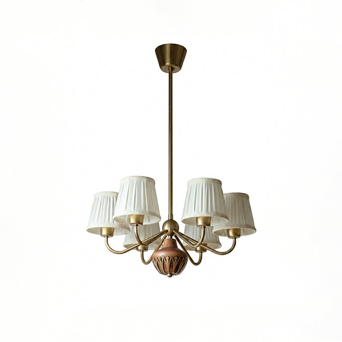Mooijane's Jeremiah chandelier exudes an elegant and tranquil atmosphere with its soft, classic lines and warm, natural materials. The sturdy wrought iron frame paired with gracefully curved lamp arms creates a balanced and airy silhouette. Wooden elements add a touch of sophistication and vintage craftsmanship, complementing the openwork metal details. Each pleated fabric shade softly diffuses light, creating a serene, warm, and layered ambiance.