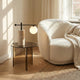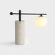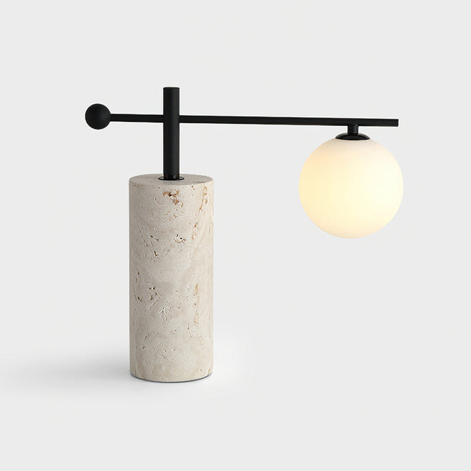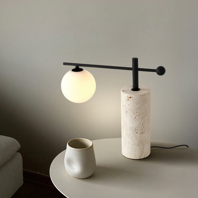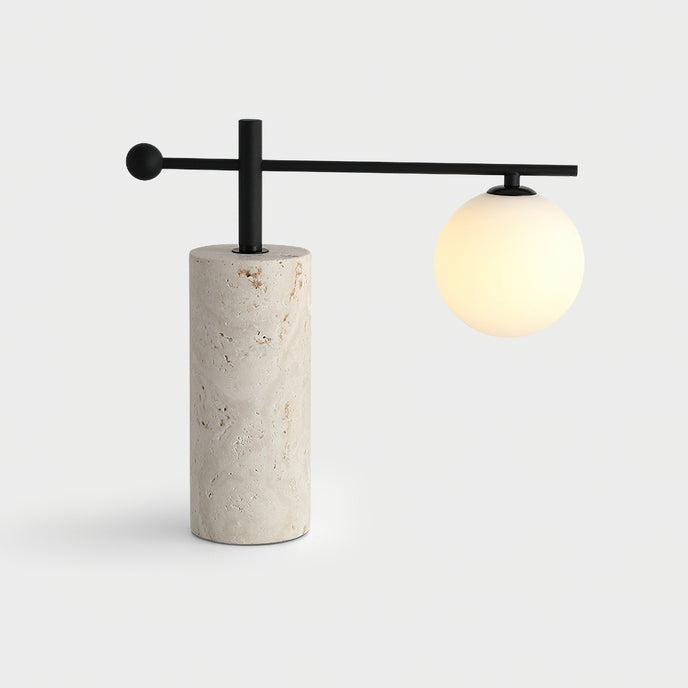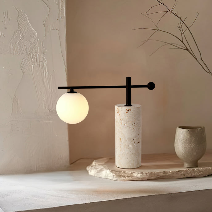 The Justine Table Lamp from Mooijane pairs warm yellow travertine with a softly glowing glass globe for a clean, modern expression. Its solid cylindrical stone base grounds the design, while a slim horizontal arm allows the round glass shade to float gracefully to one side. The contrast between the weight of the stone and the lightness of the glass creates a calm, gallery-inspired presence.