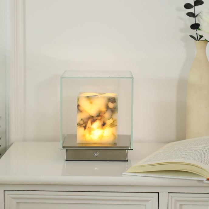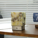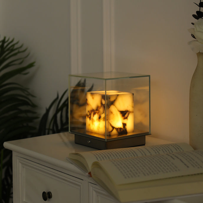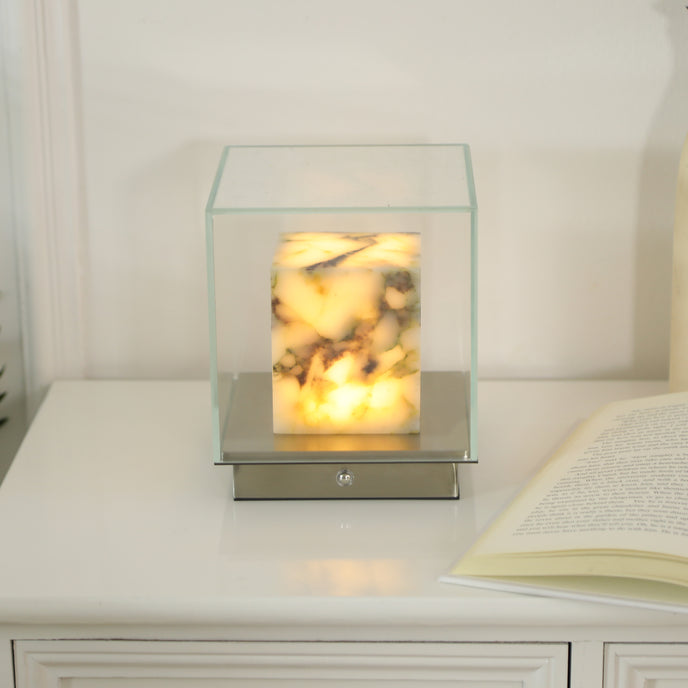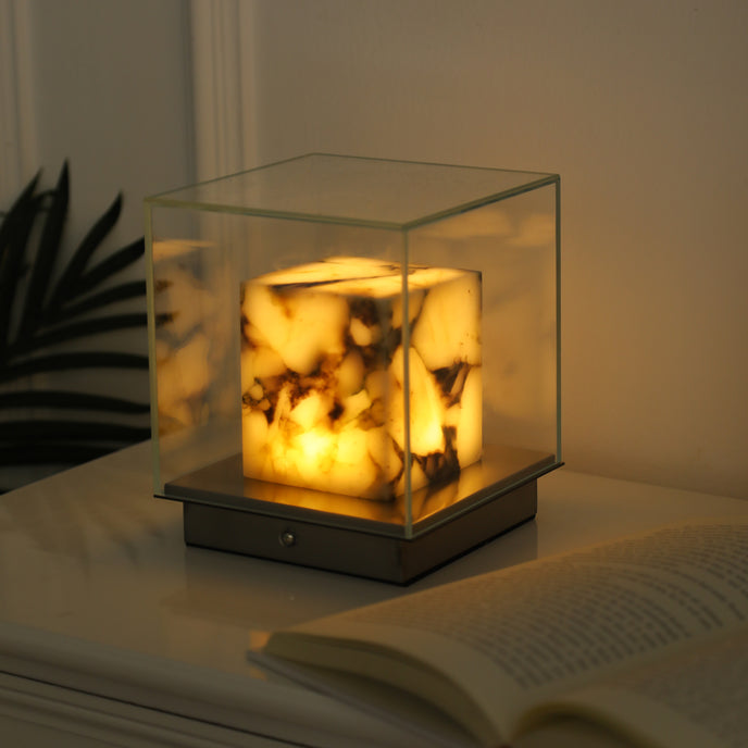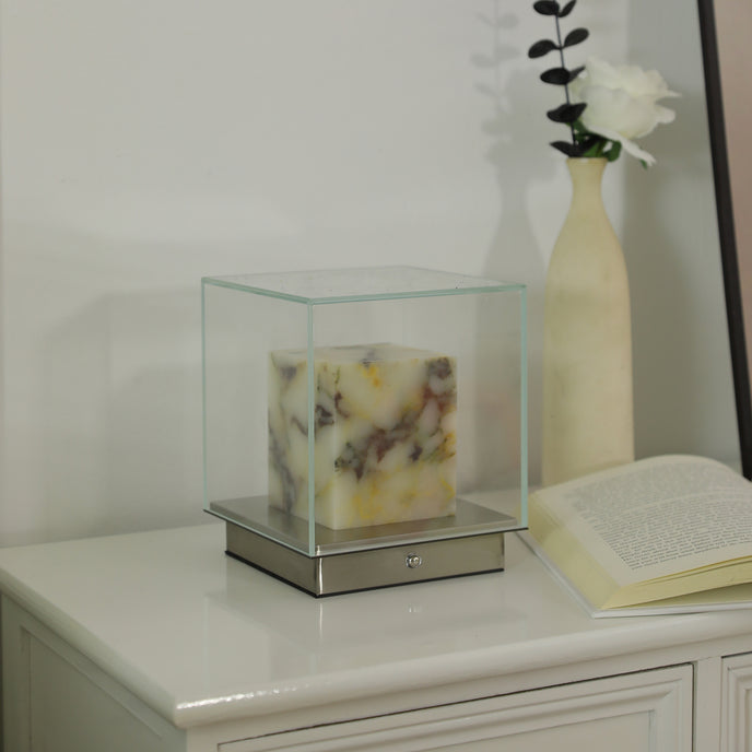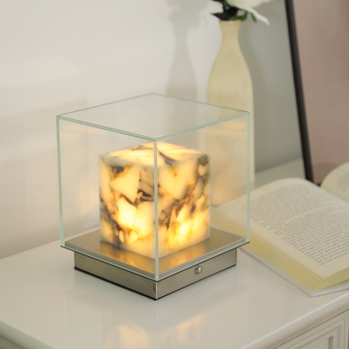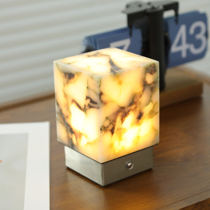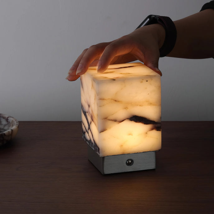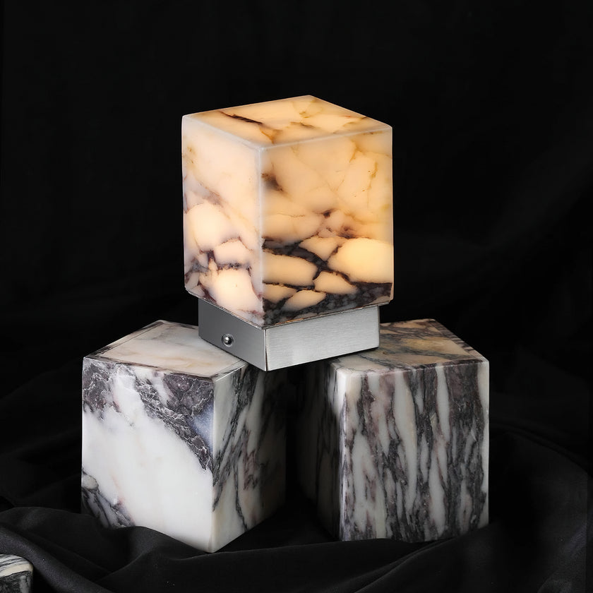 The Maillard Table Lamp from Mooijane is crafted from solid marble and meticulously handcrafted to preserve the stone’s unique veining and natural character. Mounted on a sturdy metal base, its sculptural cube design creates a captivating interplay of light and shadow, making it a striking accent for any interior.