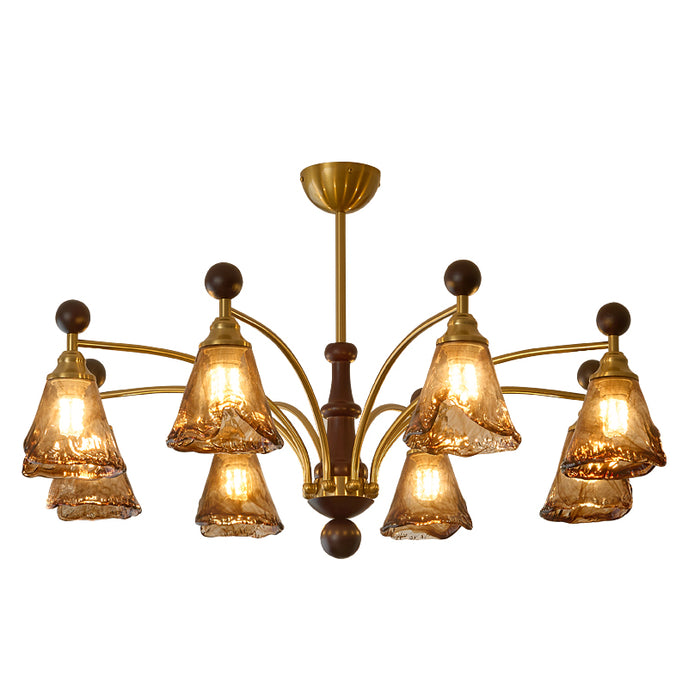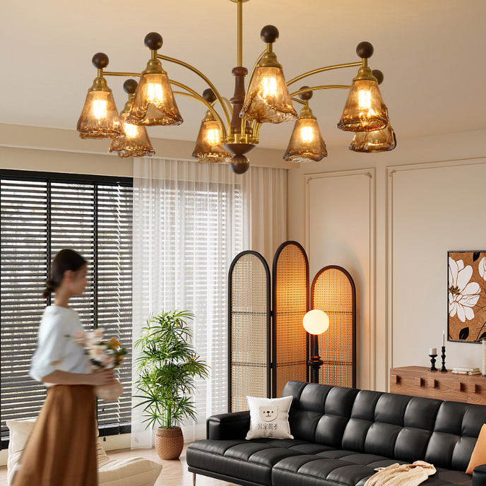 The Melvia Chandelier by Mooijane unites vintage elegance with modern craftsmanship. Its premium metal frame radiates a warm, refined sheen, while hand-blown glass shades form delicate petal-like shapes that diffuse light softly and evenly. Central wooden accents add depth and natural warmth, enhancing its organic charm. Perfect for dining rooms, living spaces, or bedrooms, this chandelier brings timeless sophistication and a gentle, inviting glow to any interior.