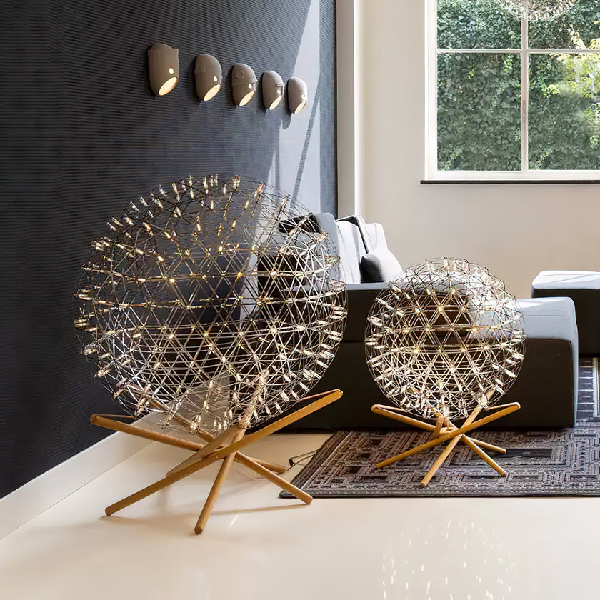 Elevate your space with the Menzel Firework Floor Lamp from Mooijane. The spherical shape and star-shaped lights create depth, while the cage frame adds an industrial touch. Perfect for foyers, living rooms, dining rooms, or entryways, this unique and stunning piece will bring luxury and glamour to any room it graces.