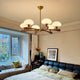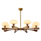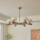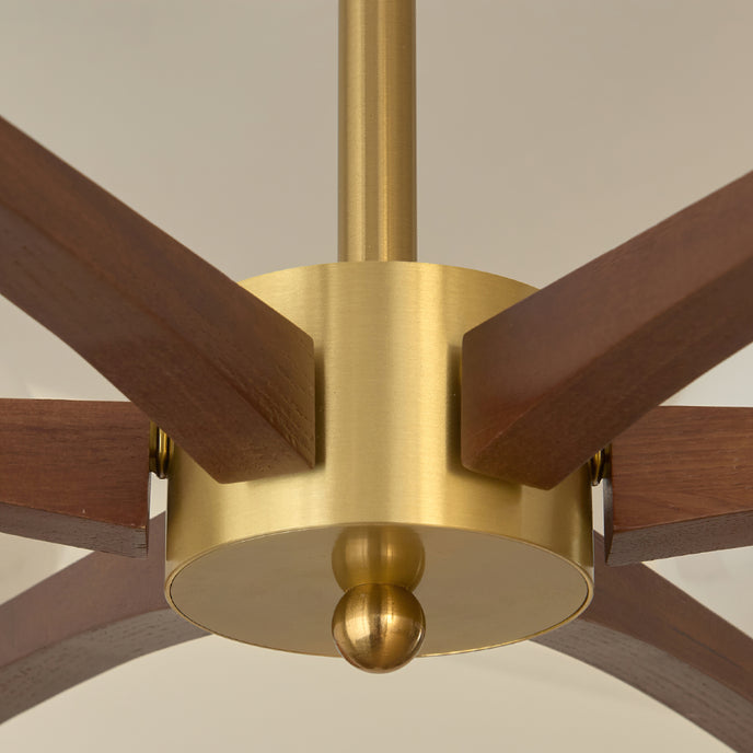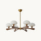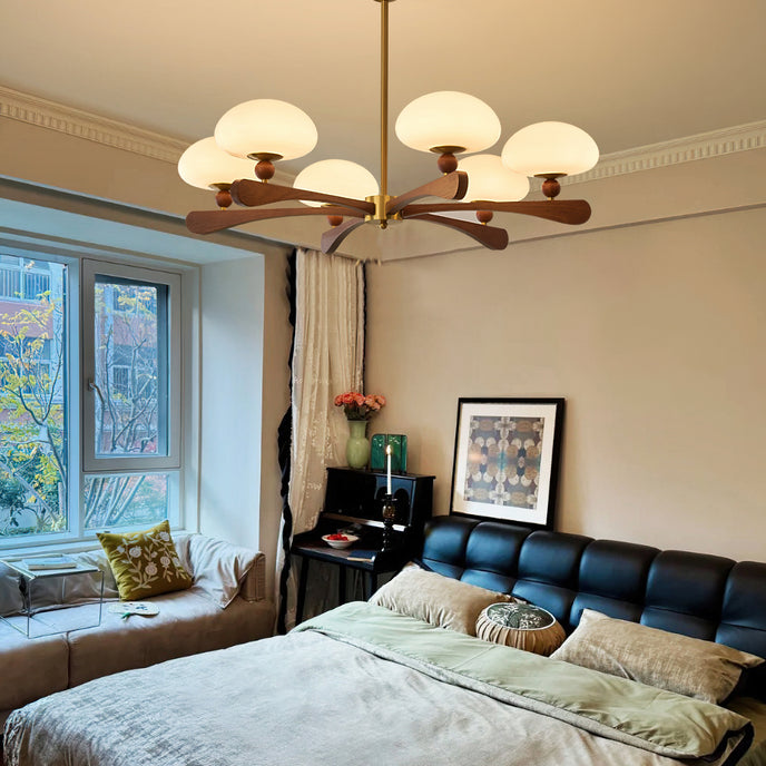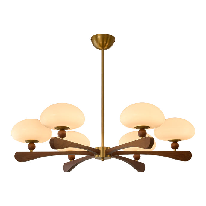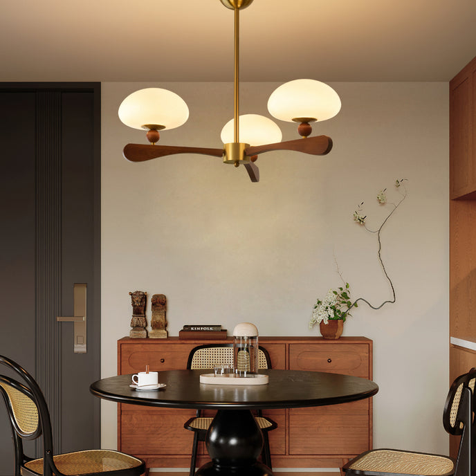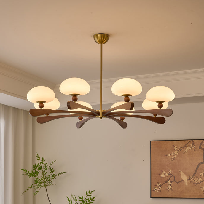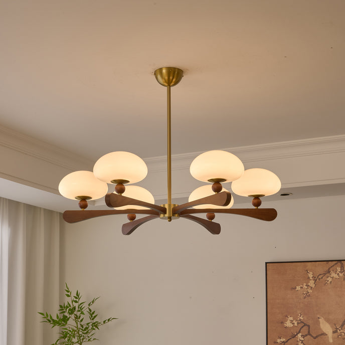The Minelti Chandelier by Mooijane harmonizes elegant form with refined structure. Its soft gold metal frame pairs beautifully with deep walnut wood arms that unfold like delicate petals, creating a sense of natural grace. The smooth glass shades emit a warm, inviting glow that enhances any interior style. Sophisticated yet versatile, this chandelier brings timeless warmth and contemporary elegance to dining rooms, living areas, or bedrooms.