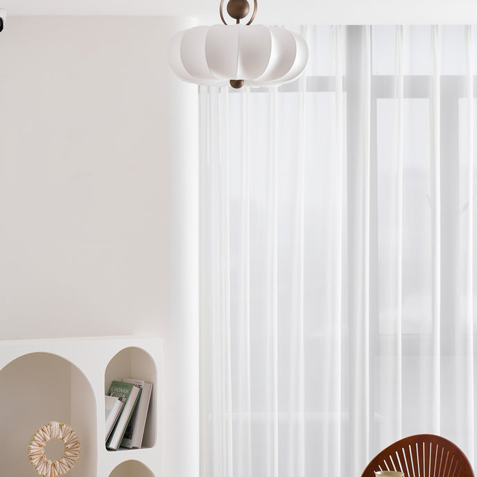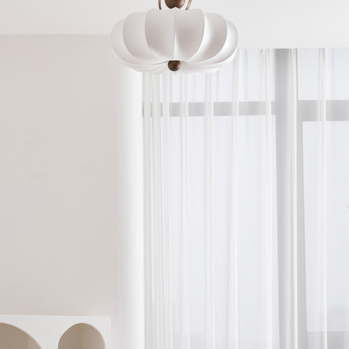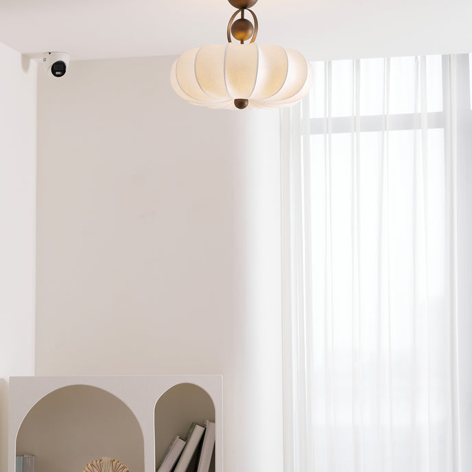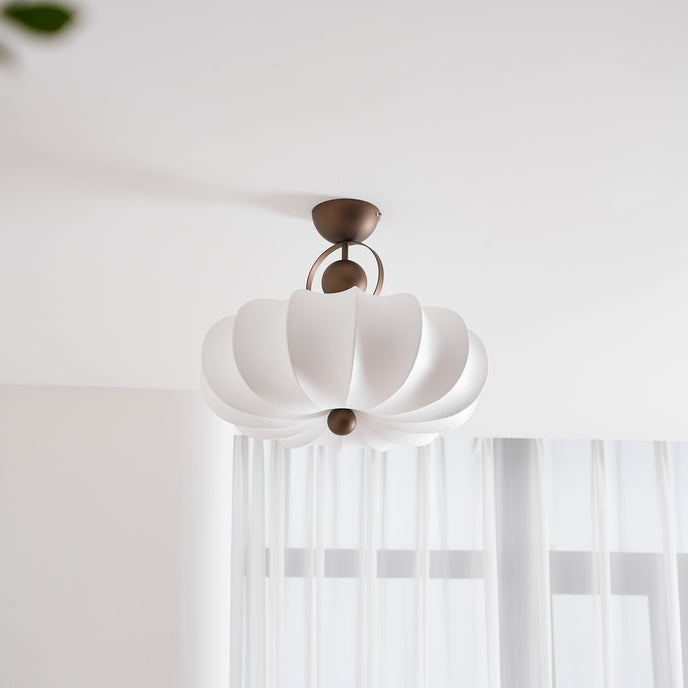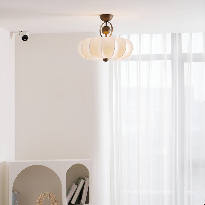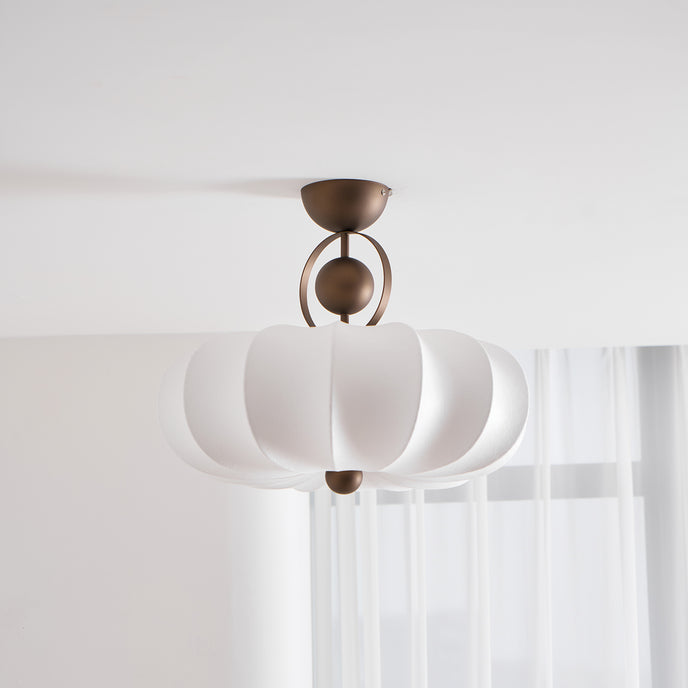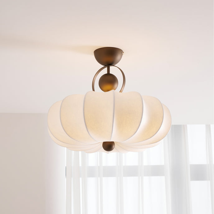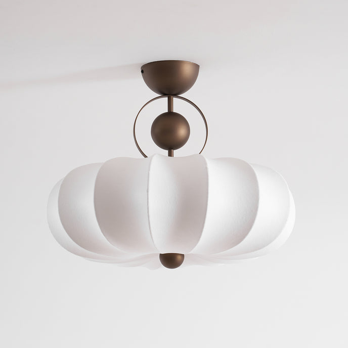 The Mirren Ceiling Light by Mooijane reinterprets the traditional lantern with modern elegance. Crafted from silk and metal, its rounded silhouette and soft curves exude refined Oriental charm. The silk shade gently diffuses light, creating a warm, tranquil glow, while the bronze-finished metal frame adds structure and a subtle vintage touch.
