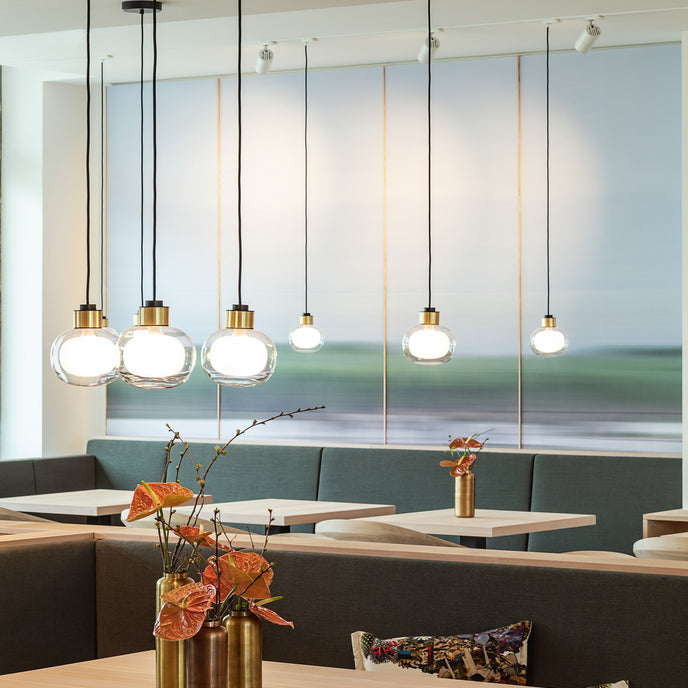 Die elegante Raffinesse der Nabila-Pendelleuchte ist von der Suche nach dem Weltraum in den 1950er Jahren inspiriert. Nabilas doppelseitiger, kugelförmiger Rahmen in Mattschwarz mit schwarzen Chromakzenten und Scheiben aus rauchfarbenem Borosilikatglas oder Mattschwarz mit Scheiben aus gebürstetem Messing und klarem Borosilikatglas ist dem Sputnik nachempfunden und verleiht einem modernen Interieur eine einzigartige Note. Platzieren Sie ihn im Eingangsbereich oder über dem Esstisch, um Ihre Ästhetik zu vervollständigen.