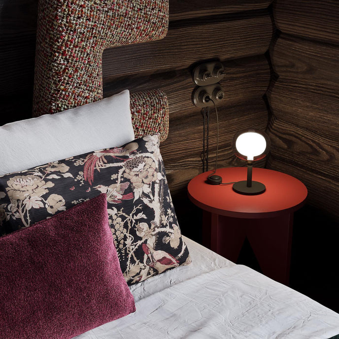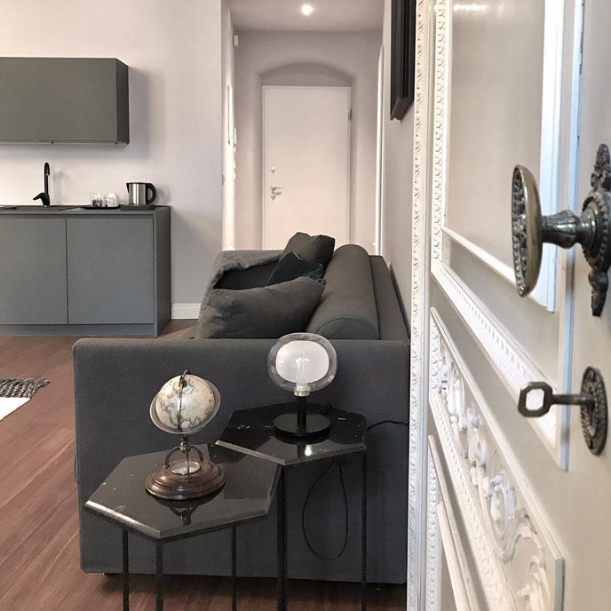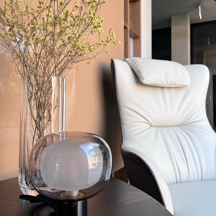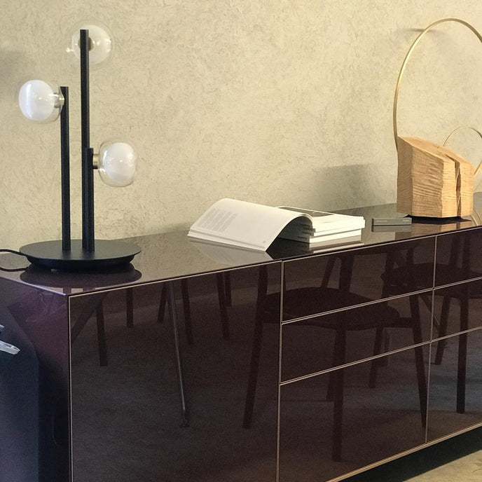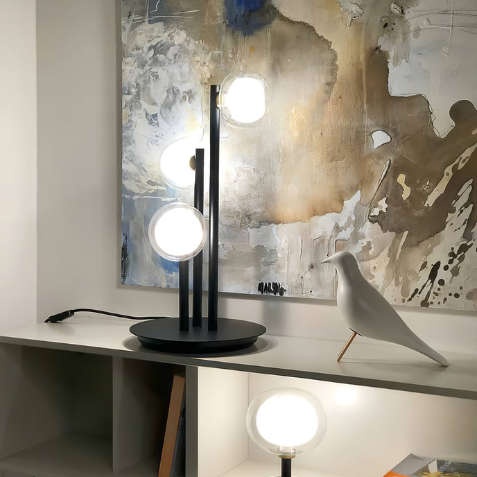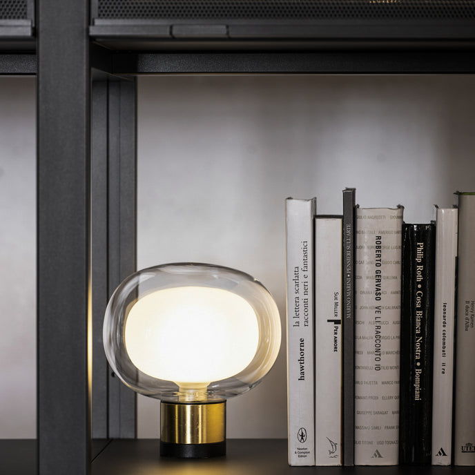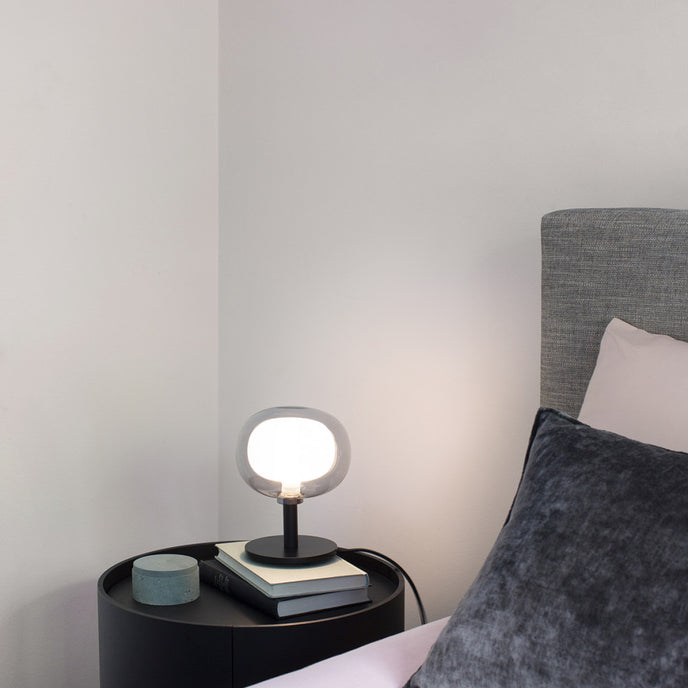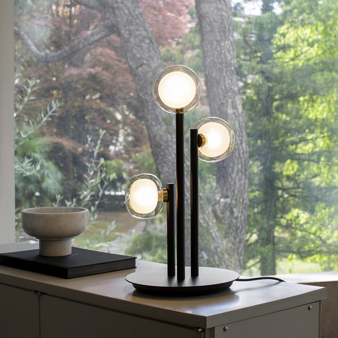 Die elegante Raffinesse der Nabila-Tischlampe ist inspiriert von der Suche nach dem Weltraum in den 1950er Jahren. Nabilas doppelseitiger, kugelförmiger Rahmen in Mattschwarz mit schwarzen Chromakzenten und Scheiben aus rauchfarbenem Borosilikatglas oder Mattschwarz mit Scheiben aus gebürstetem Messing und klarem Borosilikatglas ist dem Sputnik nachempfunden und verleiht einem modernen Interieur eine einzigartige Note. Platzieren Sie ihn im Eingangsbereich oder über dem Esstisch, um Ihre Ästhetik zu vervollständigen.