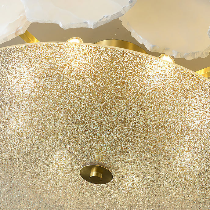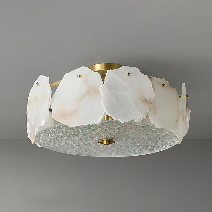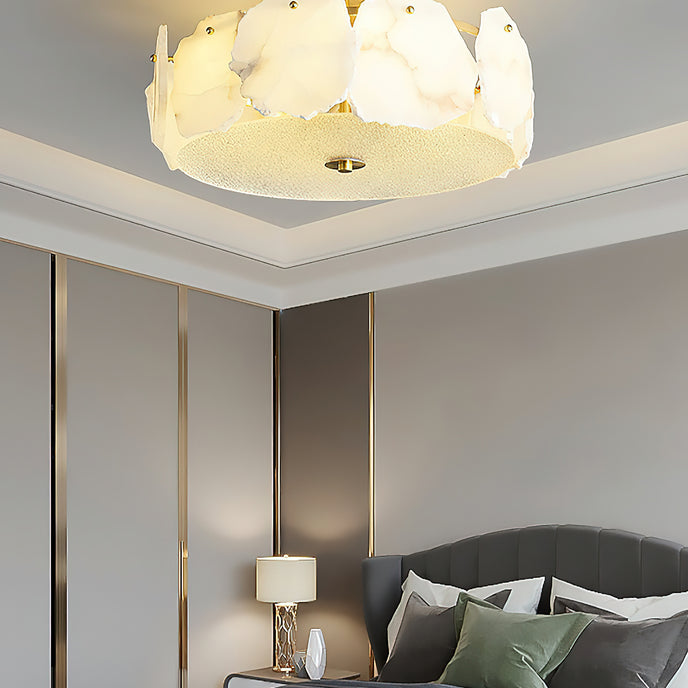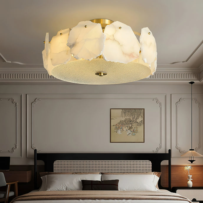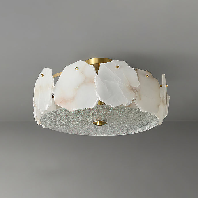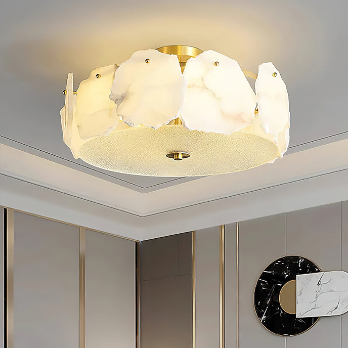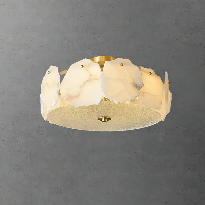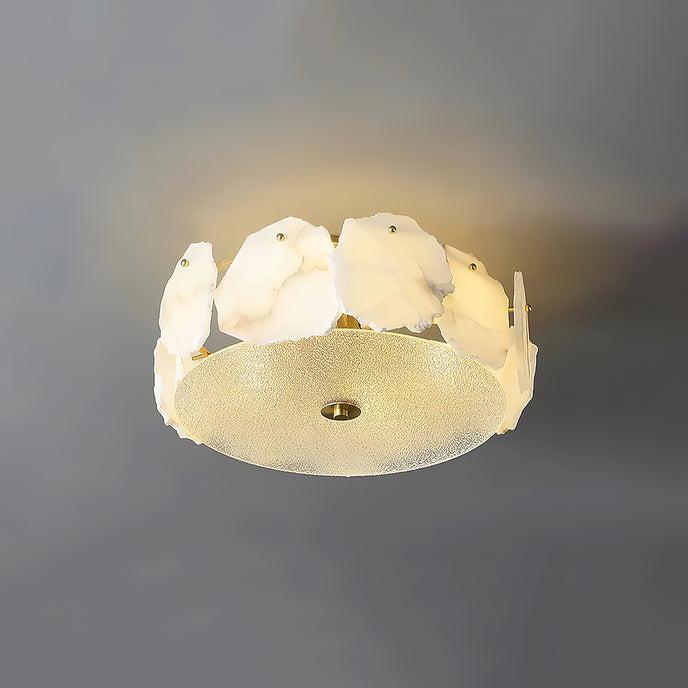 The Nasile Ceiling Light by Mooijane showcases natural elegance with its ring of raw-cut alabaster stones set against a warm golden base. Emitting a soft, diffused glow, it adds a refined, organic touch to entryways, hallways, or living spaces—perfect for creating a serene, upscale atmosphere.
