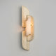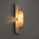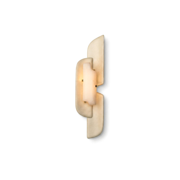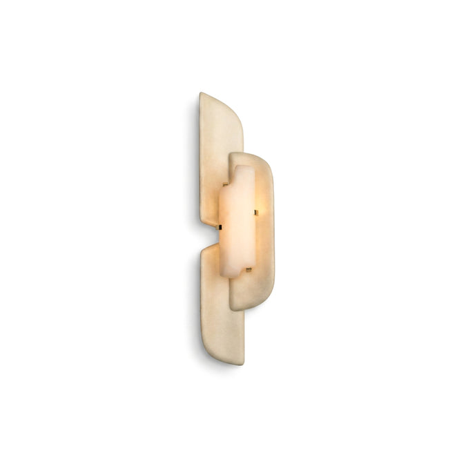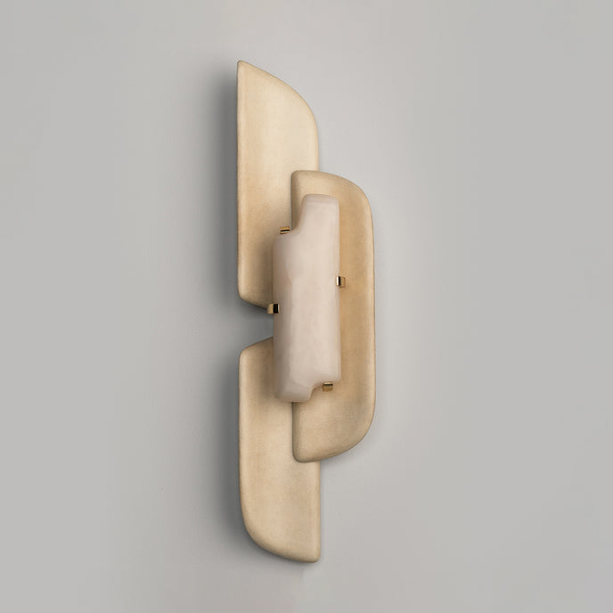 The Olmirila Wall Lamp from Mooijane features carved alabaster set in brass, layered with natural parchment to create soft, playful light effects. Its sculptural design adds depth and elegance, making it perfect for hallways, bedrooms, or accent spaces.