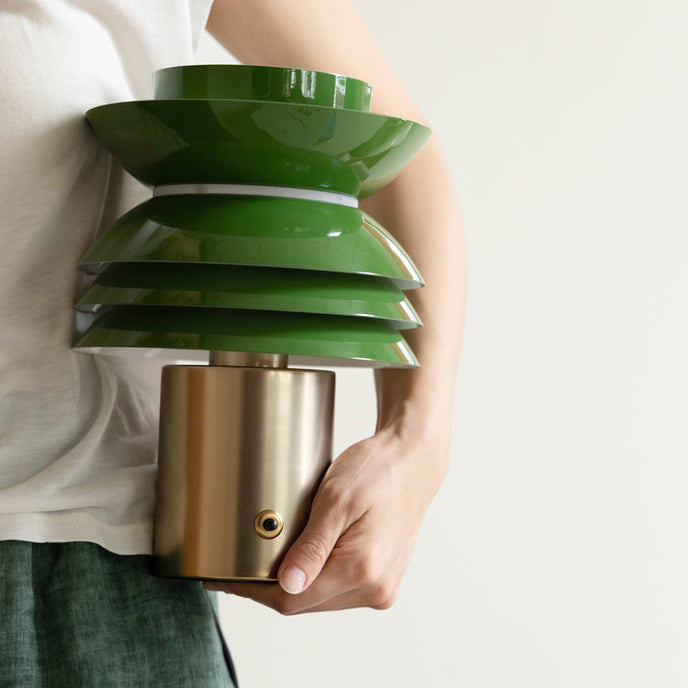 The Overlay Table Lamp from Mooijane delivers a bold, sculptural presence with its stacked metal shade and sleek cylindrical base. Crafted entirely from durable metal, the glossy layered top diffuses light softly while adding a playful, architectural edge. The brushed base provides a refined contrast, giving the lamp a polished modern feel.