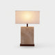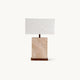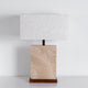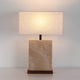 The Rashud Table Lamp from Mooijane pairs warm yellow travertine with a clean fabric shade for a calm, modern aesthetic. Its solid rectangular stone base highlights natural veining and subtle texture, making each piece uniquely one of a kind. A slim stem and simple rectangular shade keep the silhouette refined, while the woven fabric softly diffuses light into a gentle, relaxing glow.