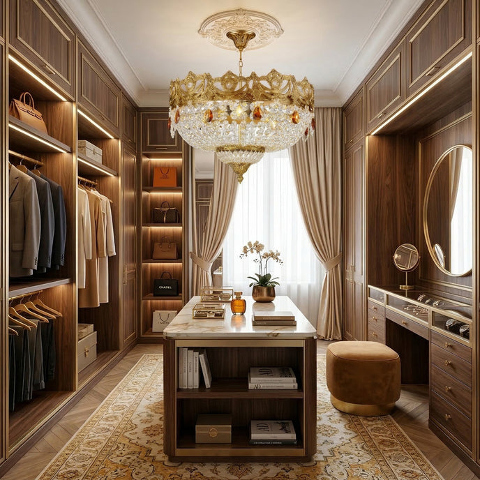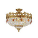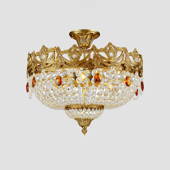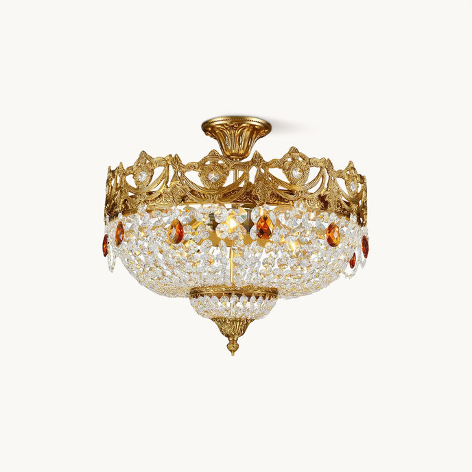 The Ravani Ceiling Light by Mooijane features an ornate brass-finished frame, sparkling crystal accents, and amber-toned drops for a look that feels luxurious and timeless. Its graceful silhouette and radiant glow bring warmth, elegance, and classic sophistication to living rooms, dining rooms, and entryways.