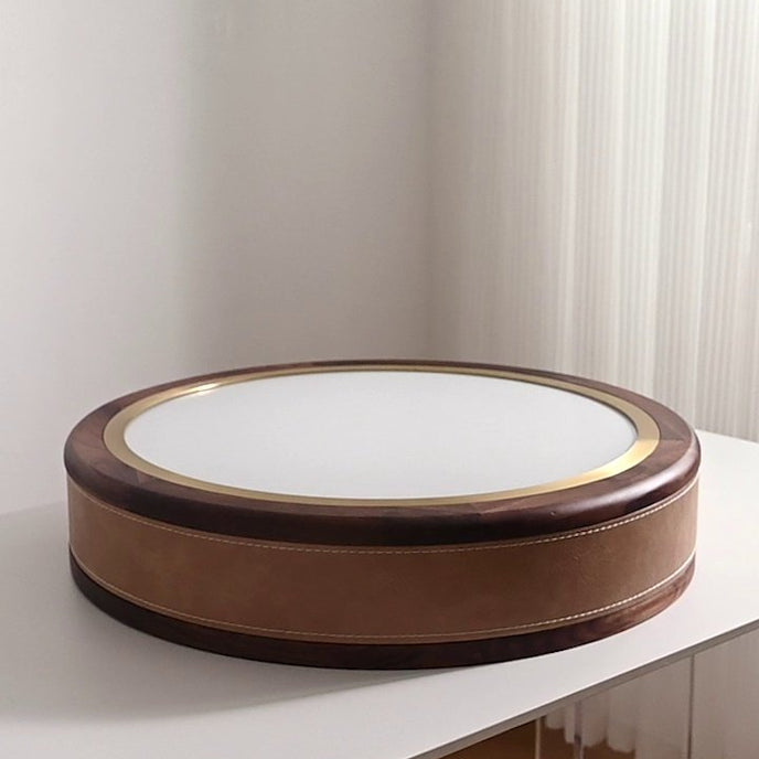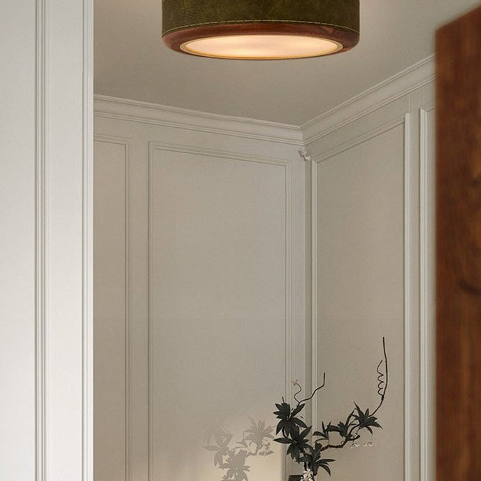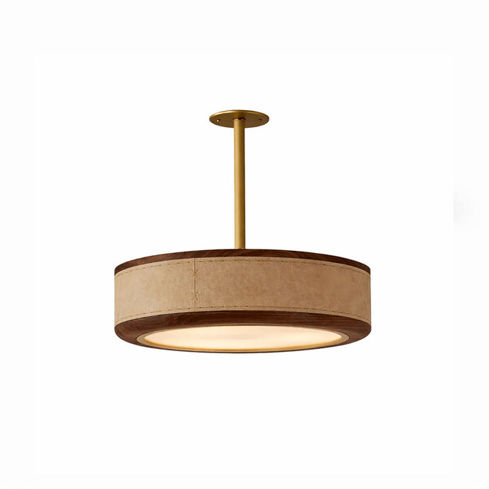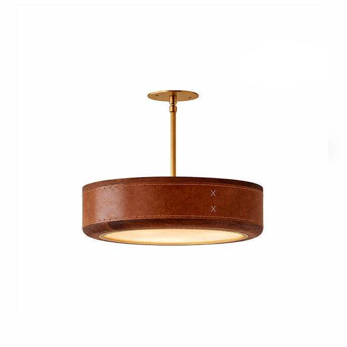 The Sarah Ceiling Light from Mooijane features a luxurious leather shade and sleek metal finish, casting a warm, soft glow. This elegant fixture adds sophistication and artisanal charm to contemporary living spaces.