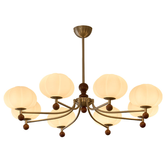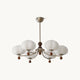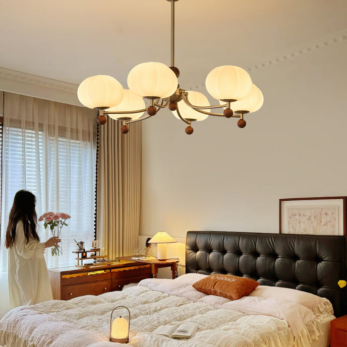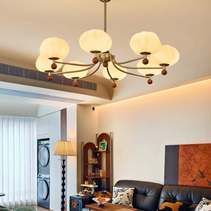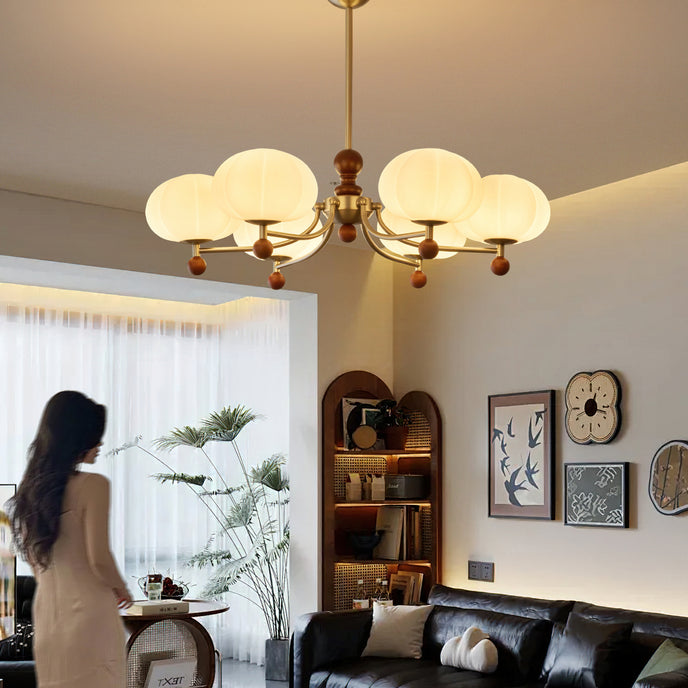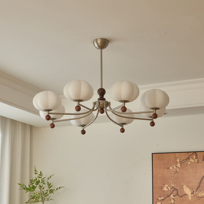 The Serento Chandelier by Mooijane harmonizes modern design with subtle Eastern elegance. Its metal frame features gracefully curved arms accented by warm wooden details, creating a refined balance of texture and form. Rounded glass shades, inspired by delicate flower buds, diffuse a soft, ambient glow that fills the space with warmth and serenity. Ideal for living rooms, dining areas, or bedrooms, this chandelier brings timeless beauty and calm sophistication to any interior.