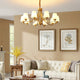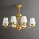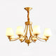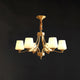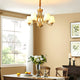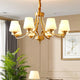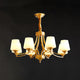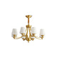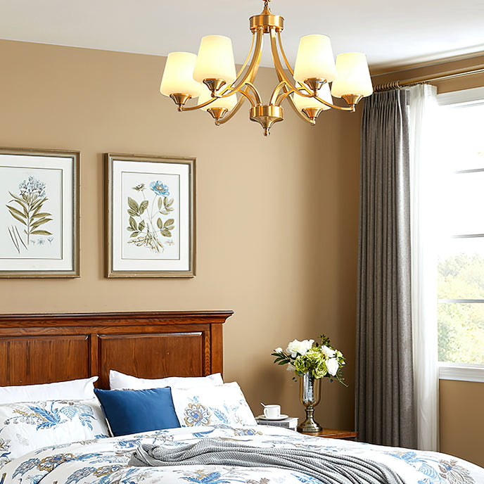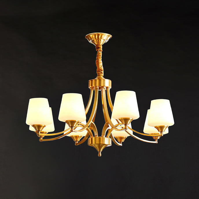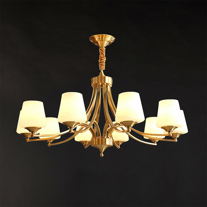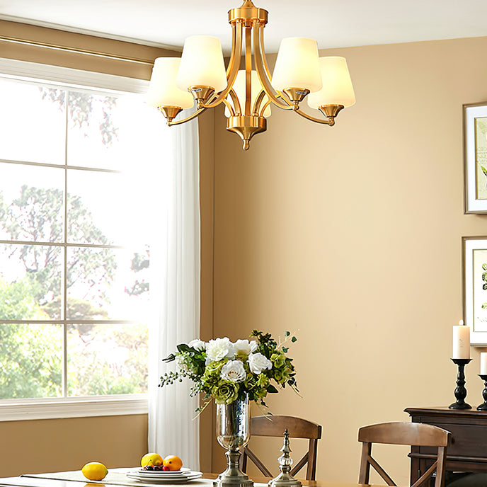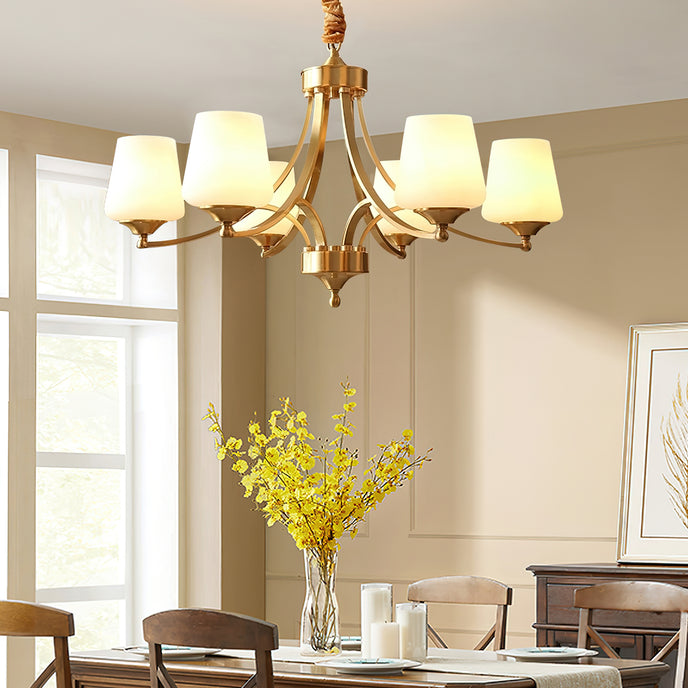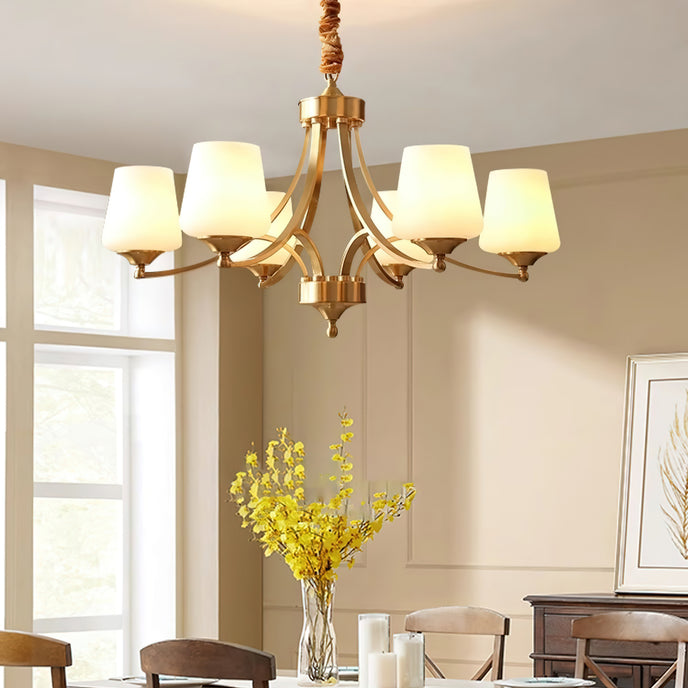 Introduce sophistication to your living room with this Tapered Glass Chandelier. Crafted with white frost glass shades and a brass fixture, this vintage-inspired pendant light exudes elegance and creates a warm, inviting ambiance. The multi-head design adds a traditional touch to your space.