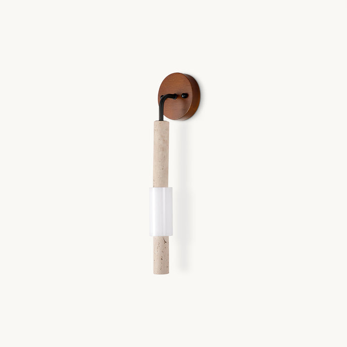 The Tersus Wall Light by Mooijane features a slim, sculptural form that pairs warm yellow travertine with rich wood. A vertical travertine rod is suspended from a rounded wooden backplate, with a softly illuminated center that evokes a modern lantern effect. Clean and minimal in profile, the natural stone texture adds depth and warmth. Ideal for hallways, bedside walls, or living room corners, this wall light provides gentle ambient illumination without overwhelming the space.