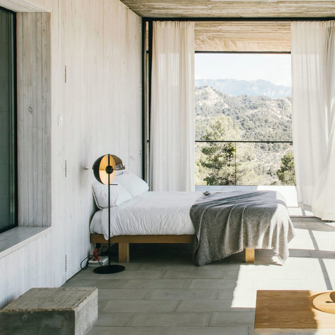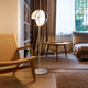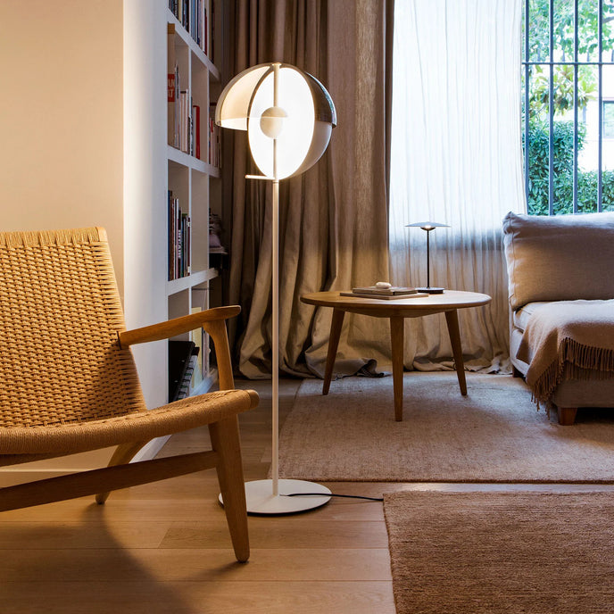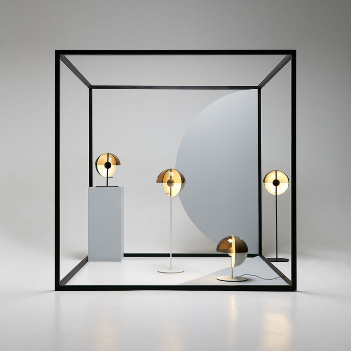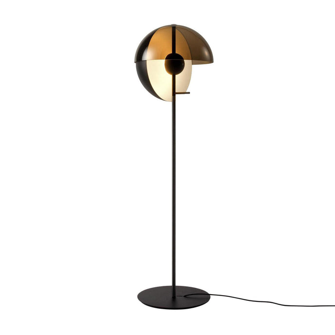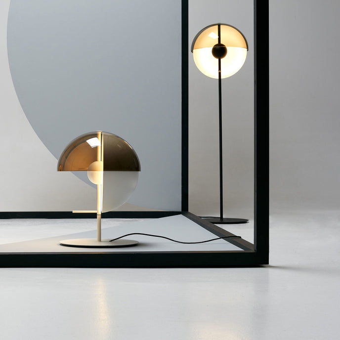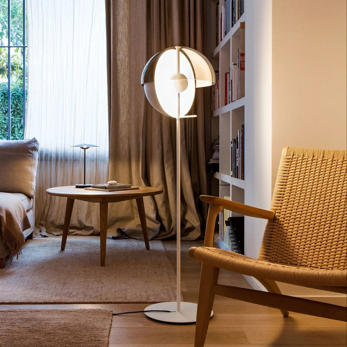 Eine Theia Stehlampe mit dem gleichen schönen Schirm ist erhältlich. Es ist eine aufregend gestaltete Stehlampe, die sich auf die Kombination von Licht und Schatten konzentriert. Die Stehleuchte hat zwei Halbkugeln, eine spendet Schatten, die andere ein dezentes, indirektes Licht. Sie können den Lampenschirm um die Mittelachse drehen, um die Richtung des Lichts einfach zu steuern, wodurch sie sich als Leselampe im Wohnzimmer eignet und perfekt im Schlafzimmer stehen kann.