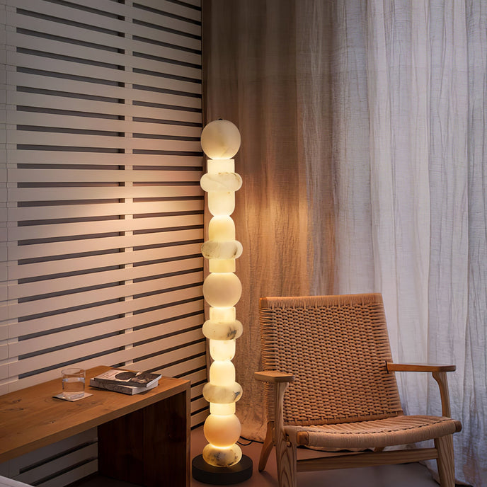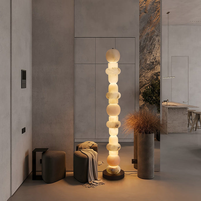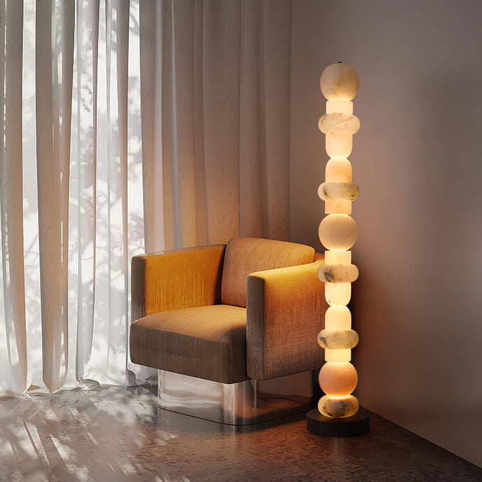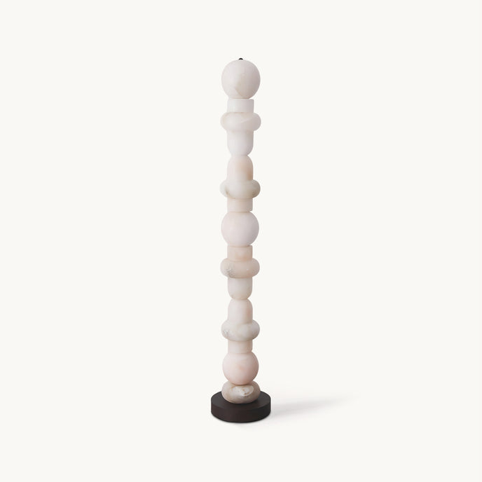 The Tribeca Alabaster Floor Lamp by Mooijane is a sculptural statement piece that fuses the natural beauty of Spanish alabaster with a refined, totemic silhouette. Stacked hand-carved alabaster blocks showcase unique veining and translucency, casting a warm, diffused glow when illuminated. Balanced by a matte black circular base, this floor lamp brings a sense of harmony, texture, and timeless elegance—perfect for modern interiors seeking artful ambiance and architectural depth.