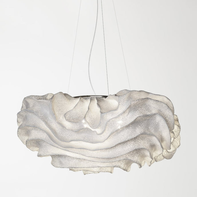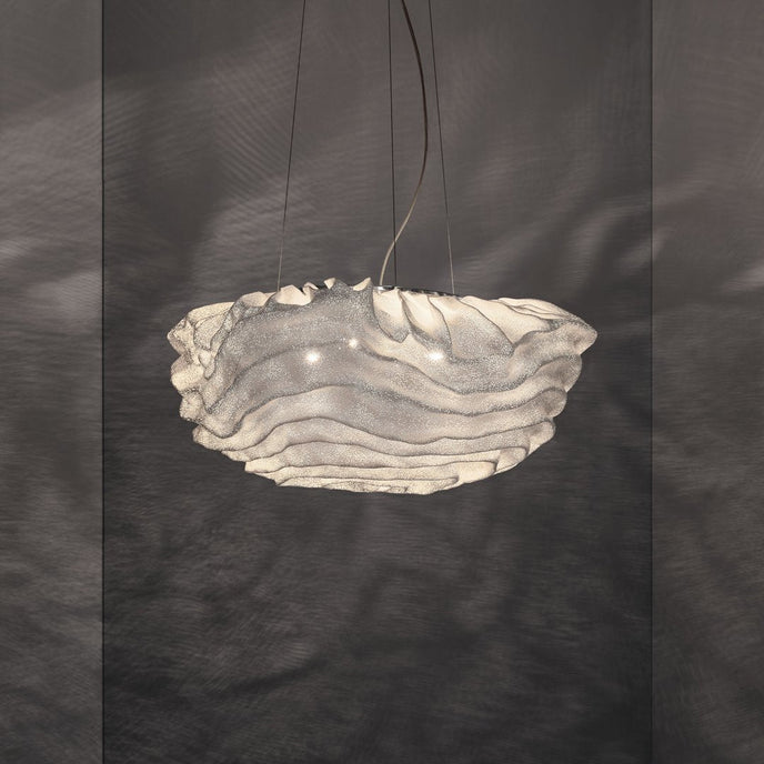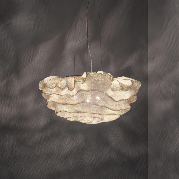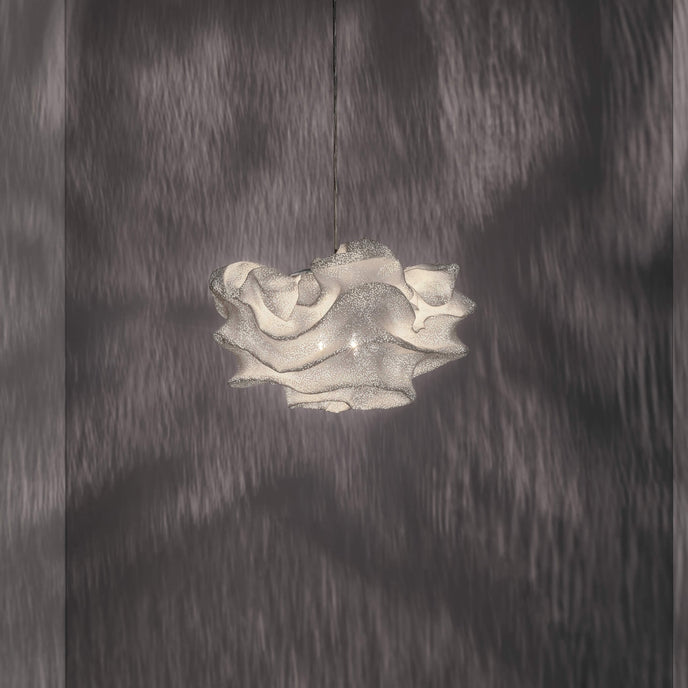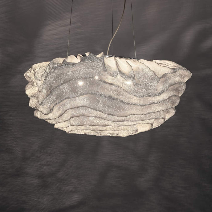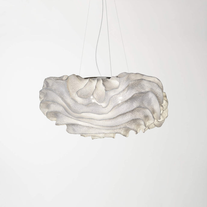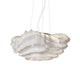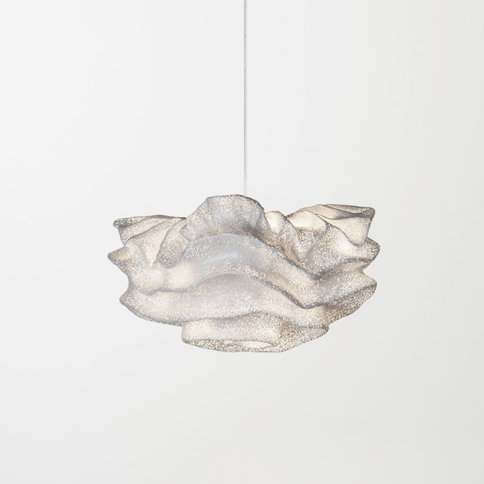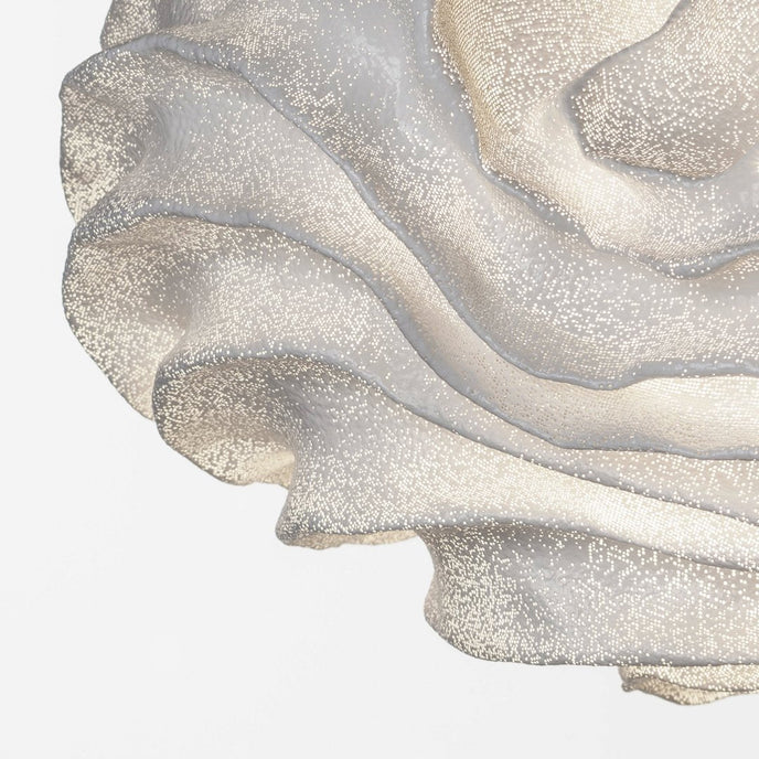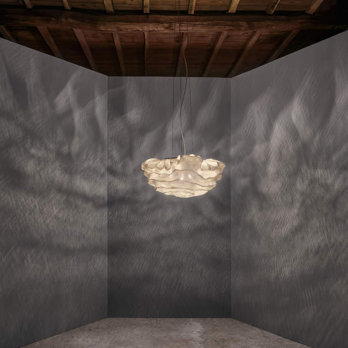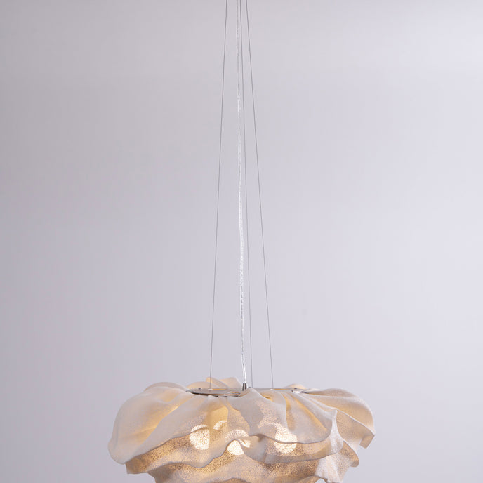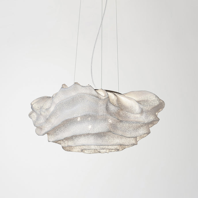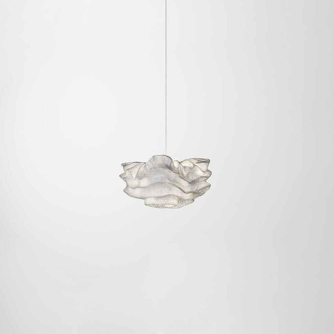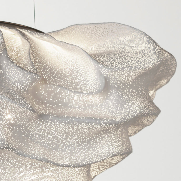 Eine organische Suspension, wie eine schwebende Rosenblüte. Die Pendelleuchte Nevo ist ein schönes Beispiel für die Plastizität, die das lackierte Edelstahlgeflecht zu bieten hat. Die Falten des Anhängers werden von Hand geformt, wodurch jeder Anhänger einzigartig und unvergleichlich wird. Wie eine Kumuluswolke, die kurz vor dem Regen steht, verändert die Formbarkeit und skulpturale Essenz des Netzes die Art der Leuchte und bildet eine Reihe von Opazitäten, die das durchscheinende Licht variieren. Alle handgefertigt, keine zwei Befestigungen sind gleich, was zu jedem Stück Originalität beiträgt.