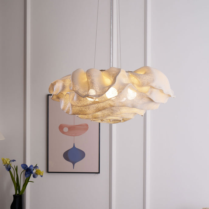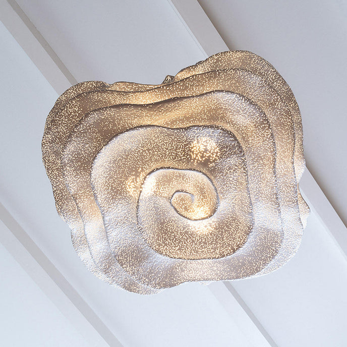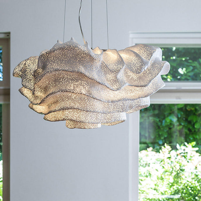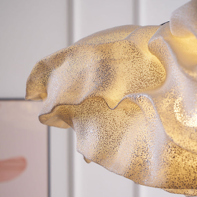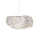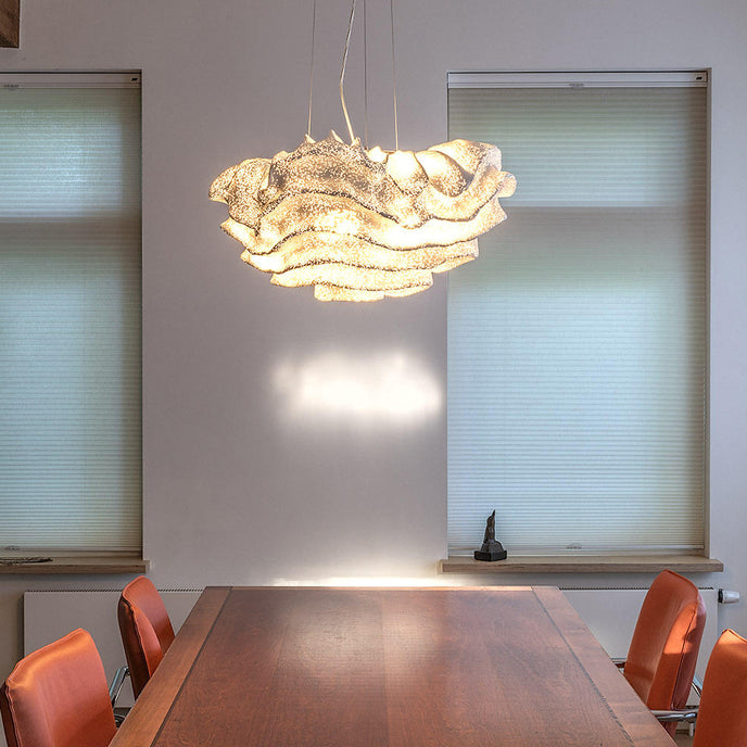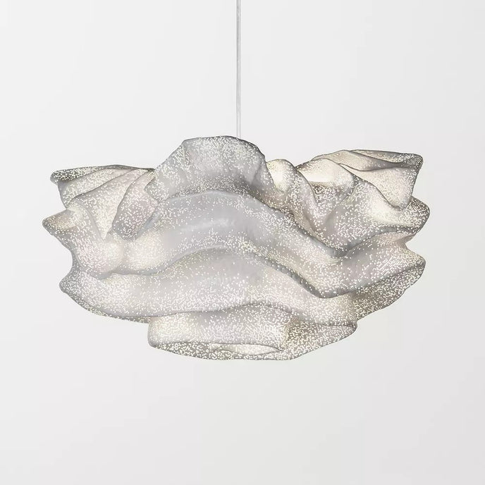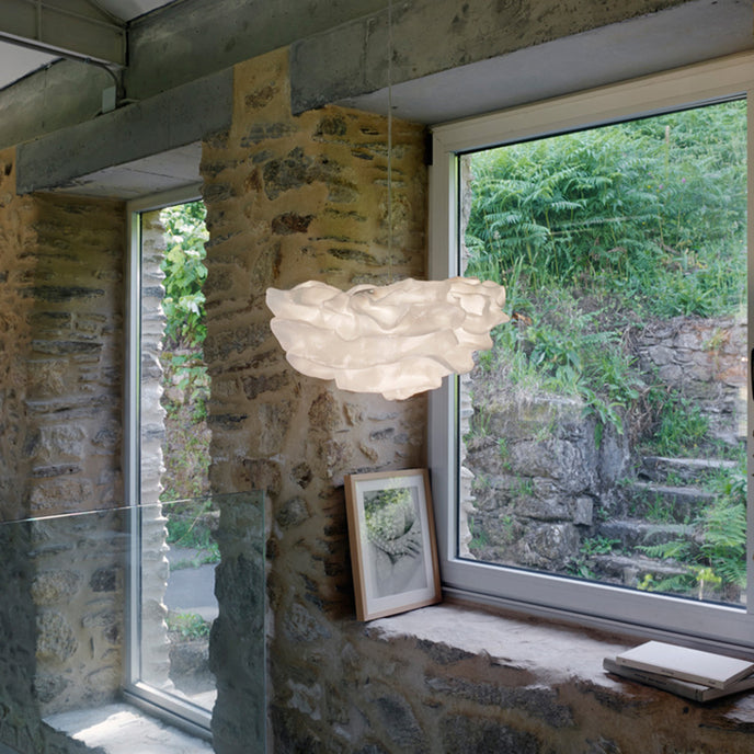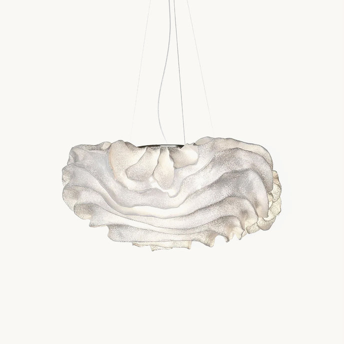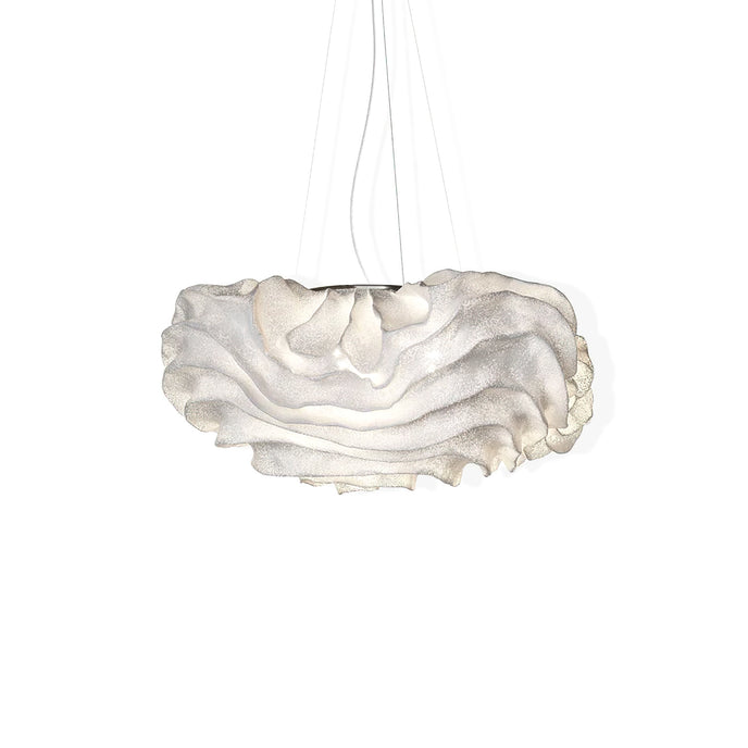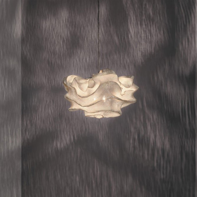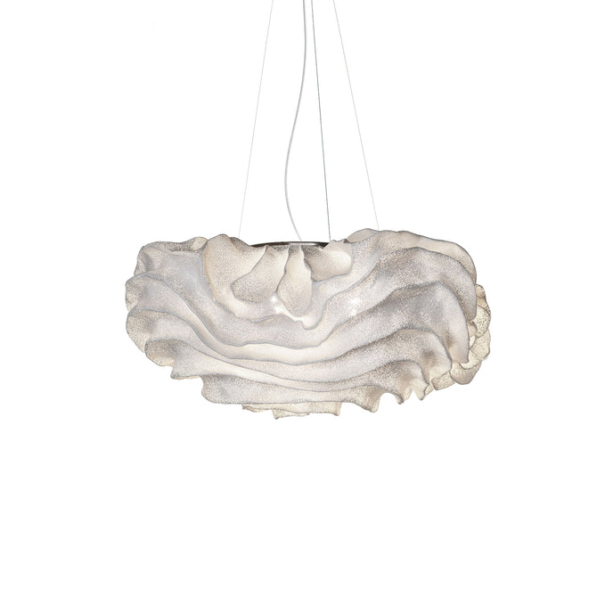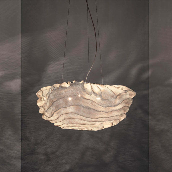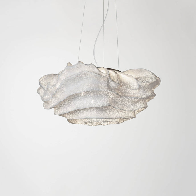 Eine organische Suspension, wie eine schwebende Rosenblüte. Die Pendelleuchte Nevo ist ein schönes Beispiel für die Plastizität, die das lackierte Edelstahlgeflecht zu bieten hat. Die Falten des Anhängers werden von Hand geformt, wodurch jeder Anhänger einzigartig und unvergleichlich wird. Wie eine Kumuluswolke, die kurz vor dem Regen steht, verändert die Formbarkeit und skulpturale Essenz des Netzes die Art der Leuchte und bildet eine Reihe von Opazitäten, die das durchscheinende Licht variieren. Alle handgefertigt, keine zwei Befestigungen sind gleich, was zu jedem Stück Originalität beiträgt.