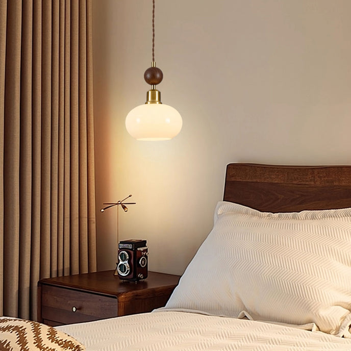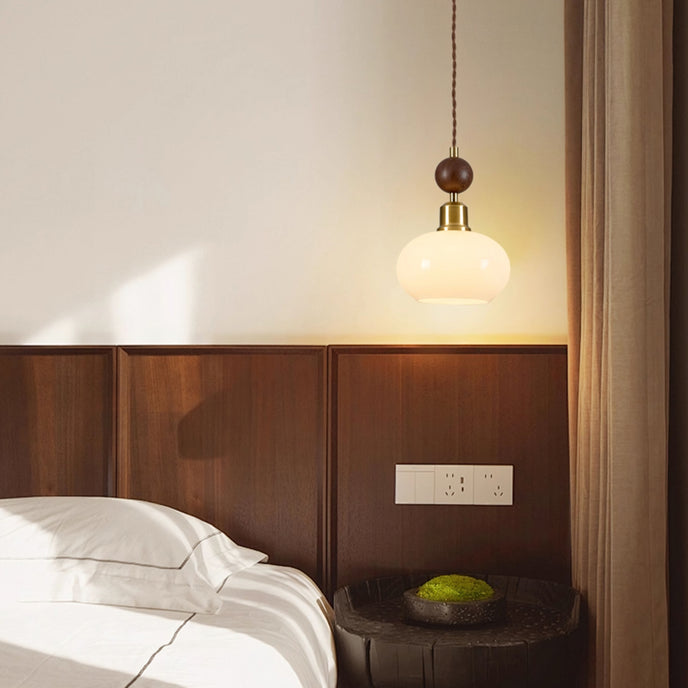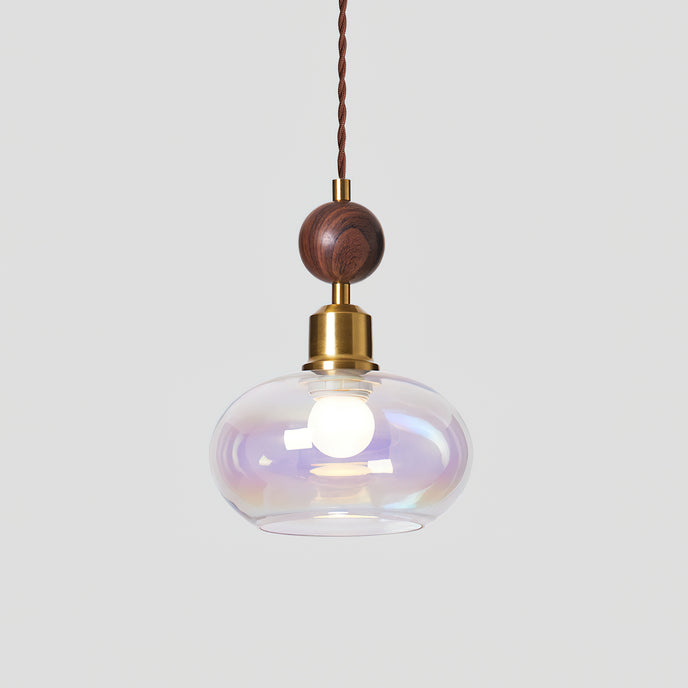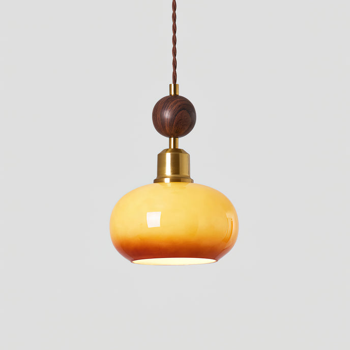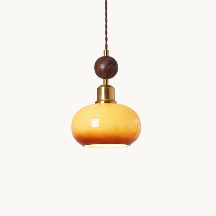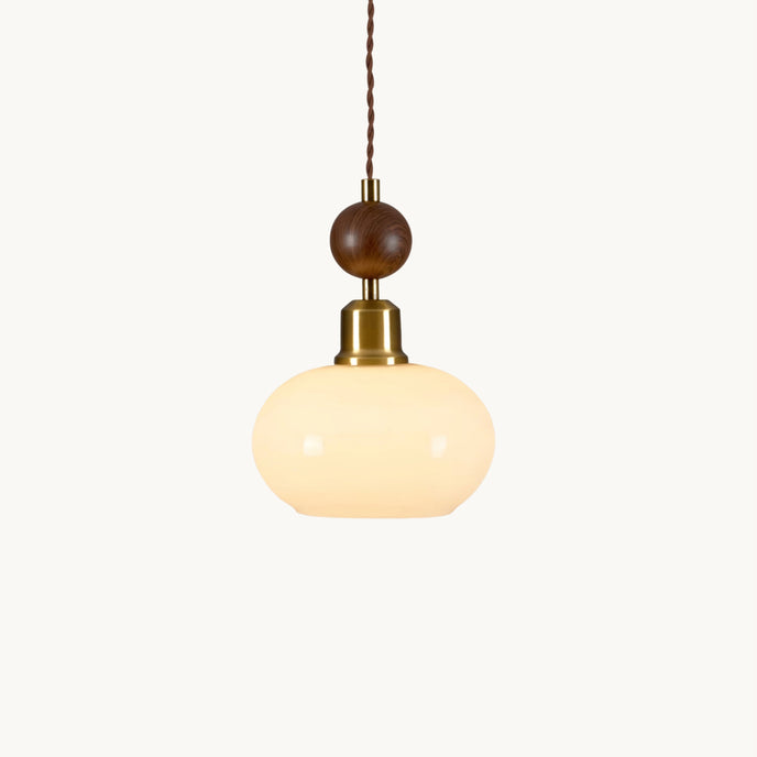 The Aitan Pendant Lamp by Mooijane combines a rounded glass shade with warm wood and sleek metal accents, blending modern simplicity with vintage charm. When illuminated, the glass emits a soft, even glow that creates a cozy, inviting ambiance. When unlit, its refined form and natural textures add style and depth to any space.