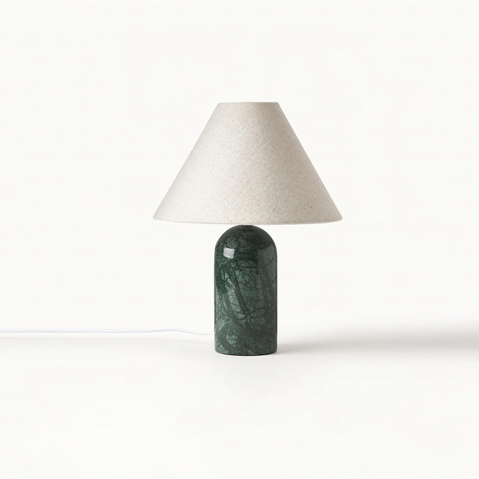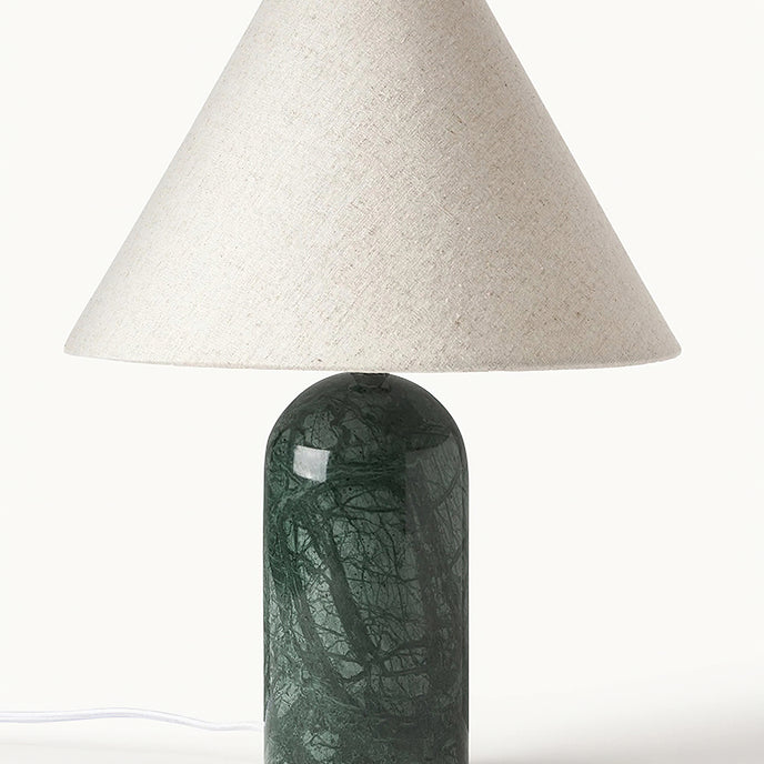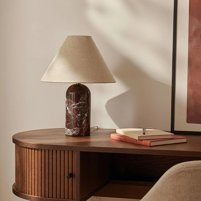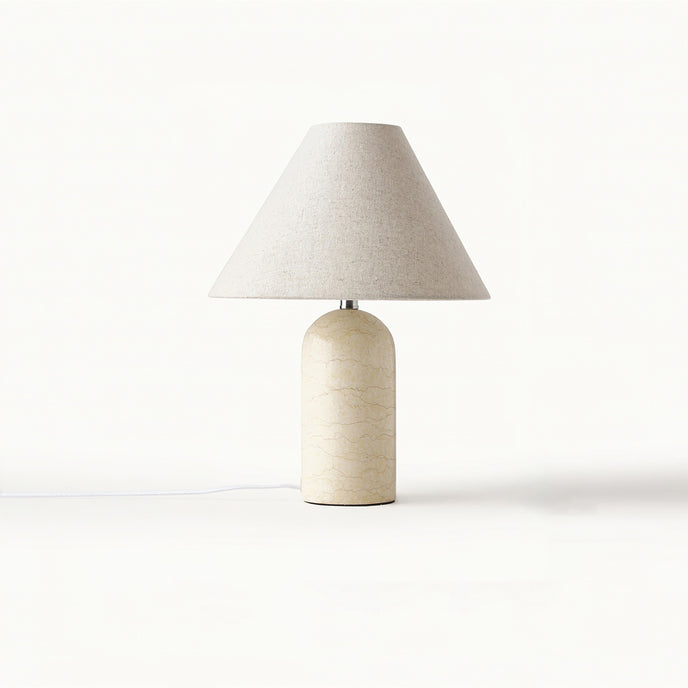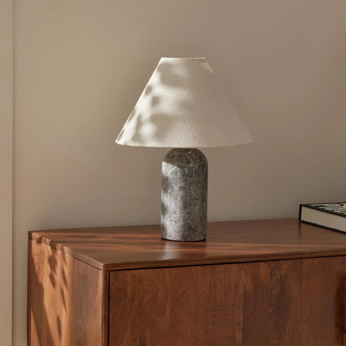 The Allister Table Lamp from Mooijane embodies timeless elegance through the refined balance of natural marble and soft fabric. Crafted from a solid block of marble, each base displays unique veining that highlights the stone’s natural beauty. Its smooth, rounded silhouette pairs effortlessly with a gently tapered fabric shade, creating a harmonious blend of texture and form. The shade softly diffuses light, casting a warm, calming glow that enhances any setting with quiet sophistication.
