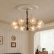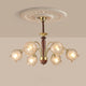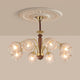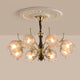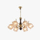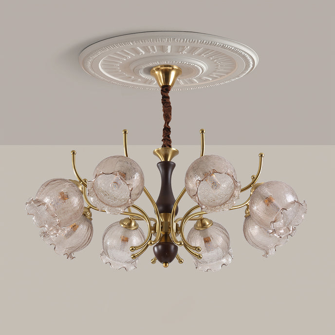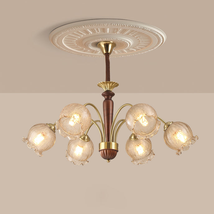 The Borelli Chandelier from Mooijane features a solid wood central column, complemented by streamlined metal arms and a handcrafted glass shade inspired by a flower bud. Its delicately textured, petal-shaped glass diffuses a soft amber glow, creating a warm, layered ambiance. The semi-flush design suits standard ceiling heights, making it ideal above dining tables, in living rooms, bedrooms, or hallways—adding a refined, vintage-inspired focal point to any interior.