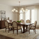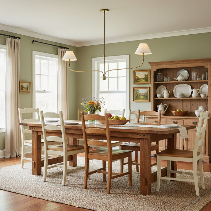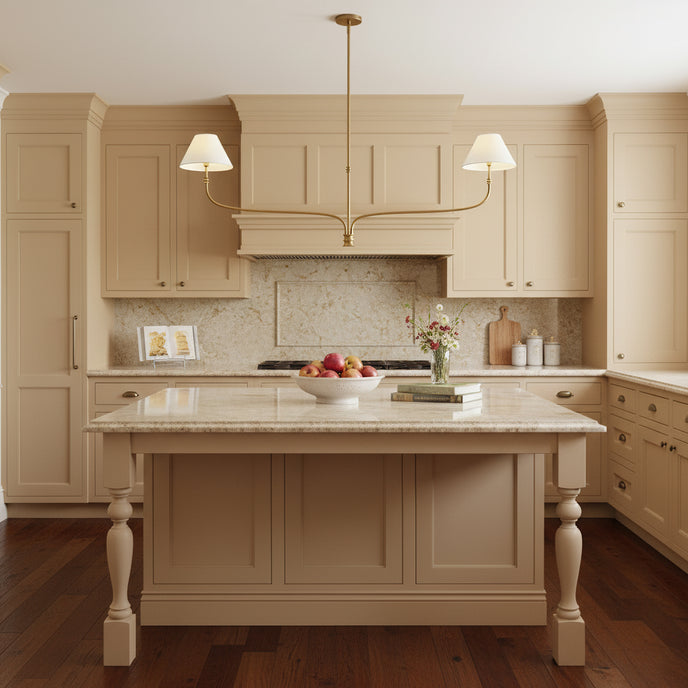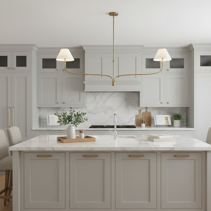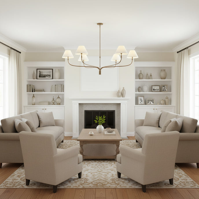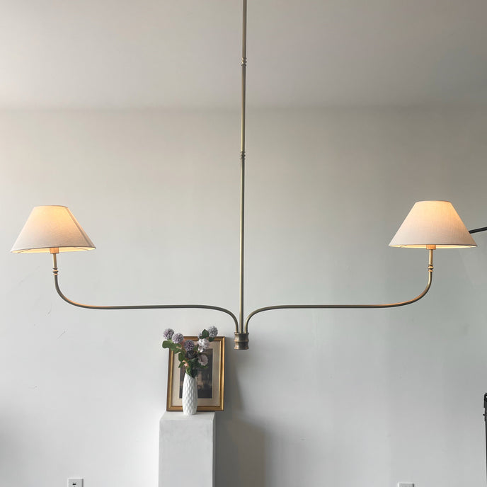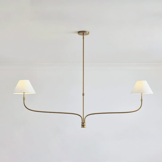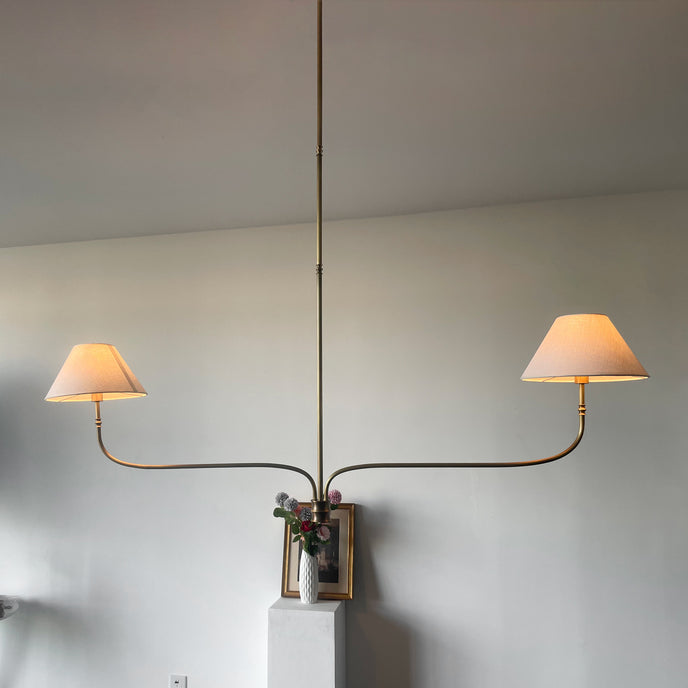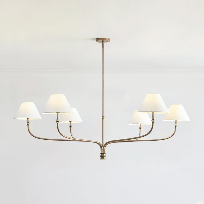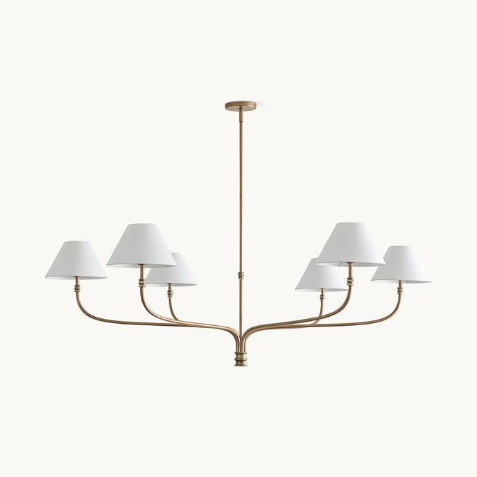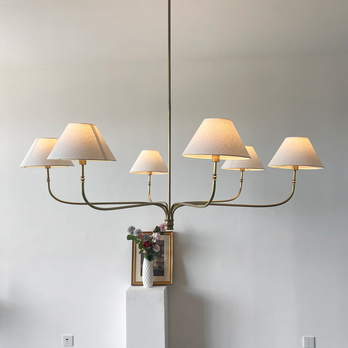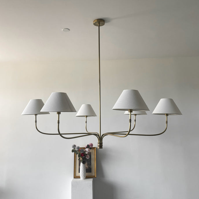 The Collins Chandelier by Mooijane features gracefully curved arms and slender tapered shades, creating a timeless and sophisticated centerpiece. Its balanced design and refined brass elements add warmth and elegance, making it a captivating addition to any space.