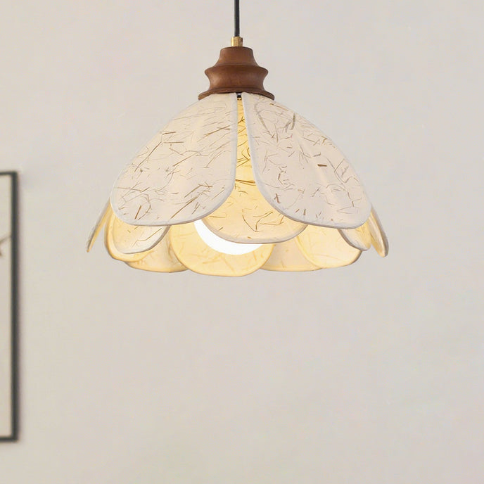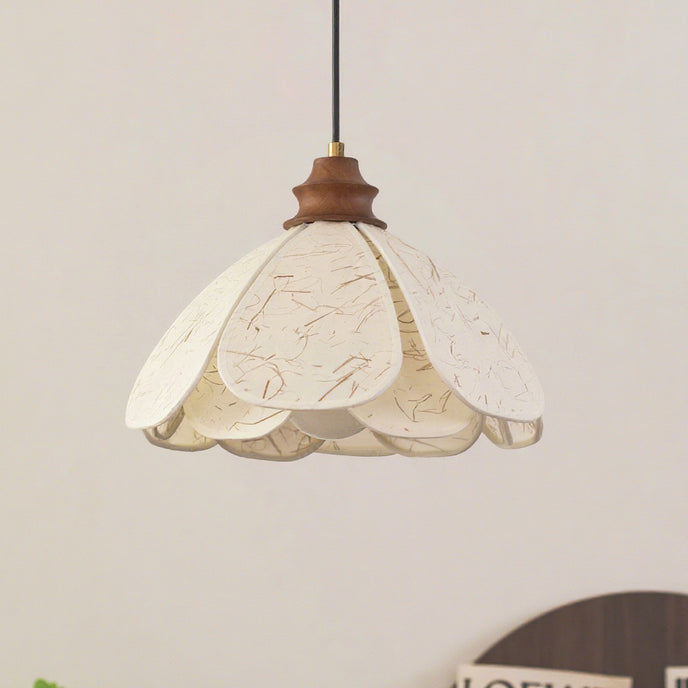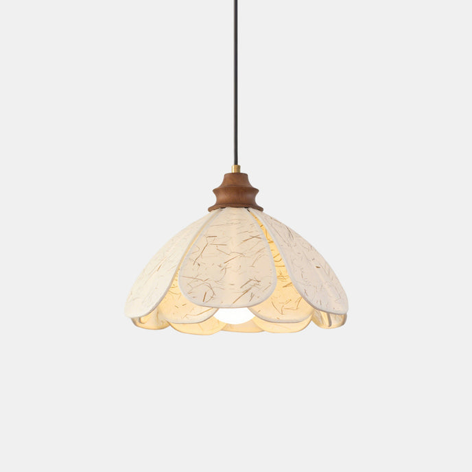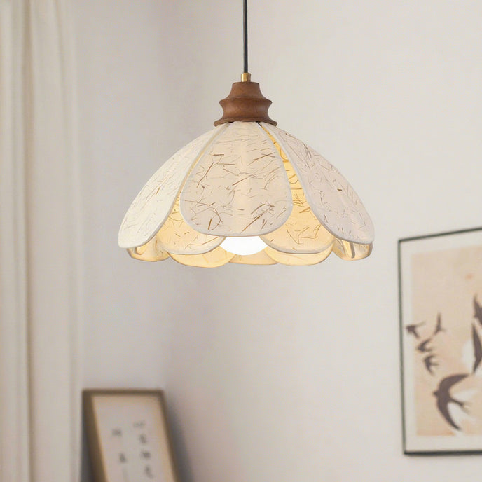 The Dorinda Pendant Lamp by Mooijane draws inspiration from the graceful form of a blossoming flower. Its petal-shaped shade, crafted from delicately textured fabric with natural fiber accents, diffuses light into a warm, inviting glow. The soft ivory tone enhances its gentle illumination, while a smooth wooden crown adds an organic touch. Blending nature-inspired beauty with modern simplicity, it’s an elegant choice for dining areas, reading nooks, or bedrooms.