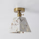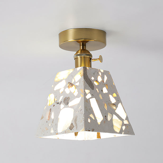 The Eldrid Ceiling Lamp by Mooijane blends mid-century character with organic elegance. Its semi-flush design features a conical translucent stone shade with amber-toned terrazzo-inspired detailing, creating a warm, refined glow. Sculptural and sophisticated, it adds distinctive style to any interior.