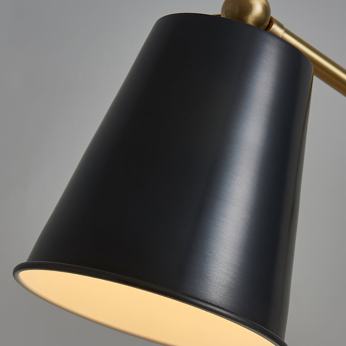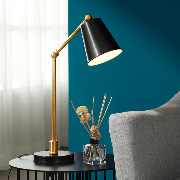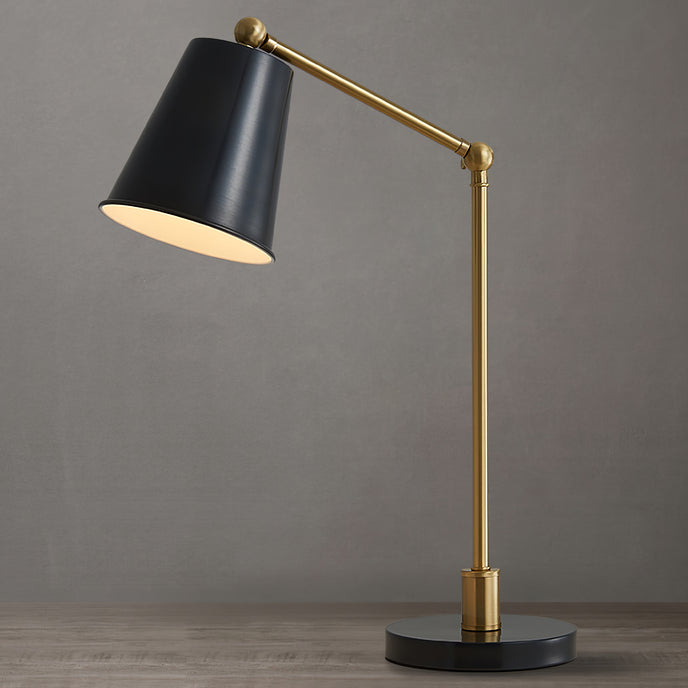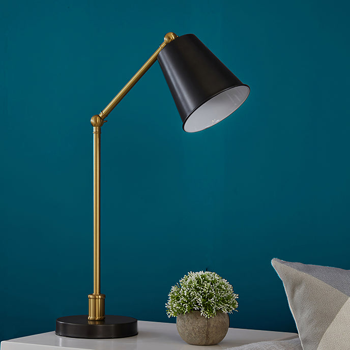 An essential addition to mid-century modern decor, the Epinal Desk Lamp is both functional and stylish. A small footprint allows this piece to fit neatly on the nightstand or desk without taking up too much space. An adjustable shade allows for light to be directed where it is needed. A painted black metal finish is accented by an elegant black metal base.