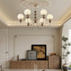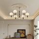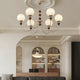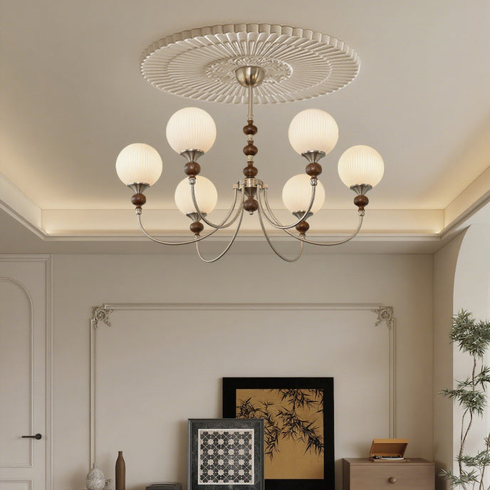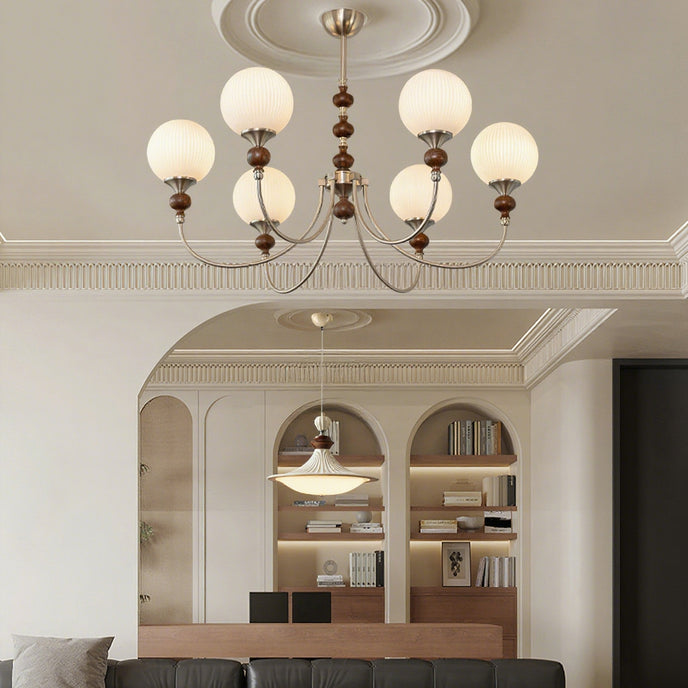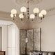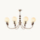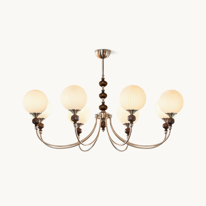 The Erica Chandelier by Mooijane combines refined metalwork with softly sculpted glass shades to create an elegant balance of retro and modern design. Its curved metal arms flow with natural grace, finished with a sophisticated luster that highlights the detailed centerpiece. The spherical glass shades, delicately textured, diffuse a warm and even glow, filling the room with comfort and romance.