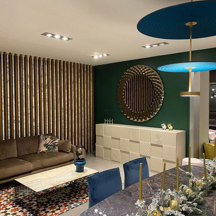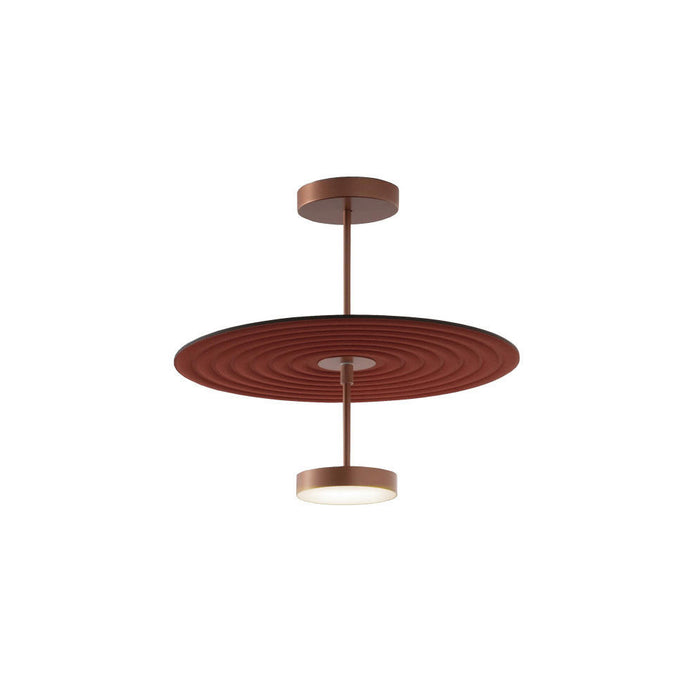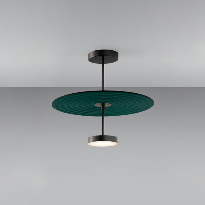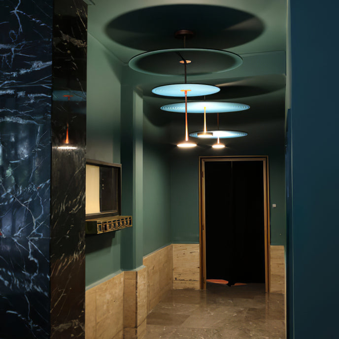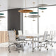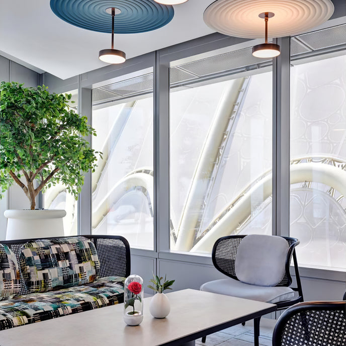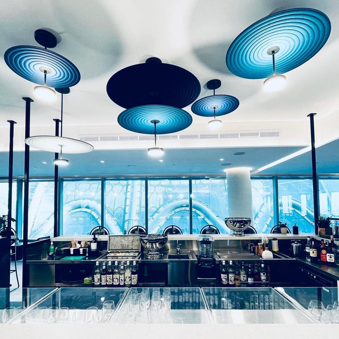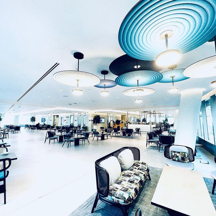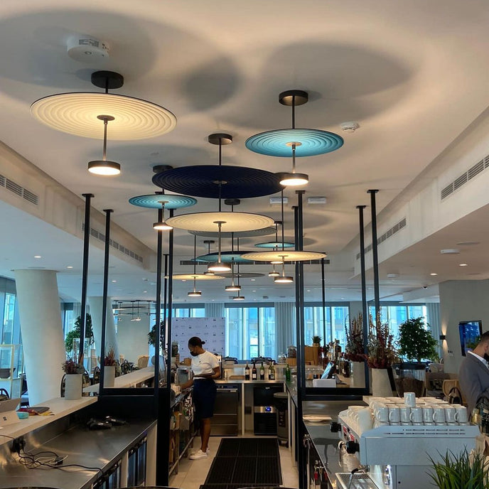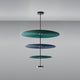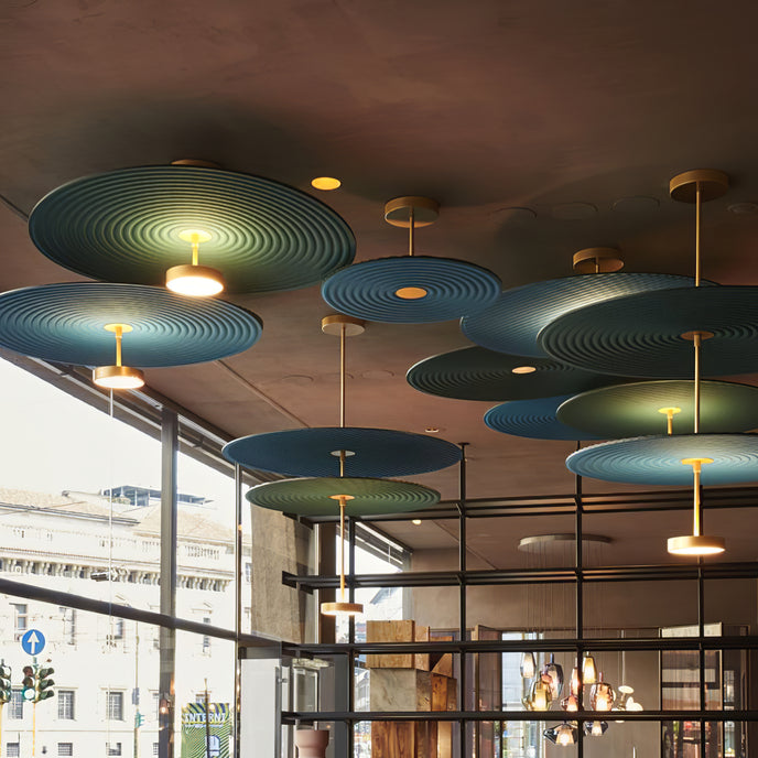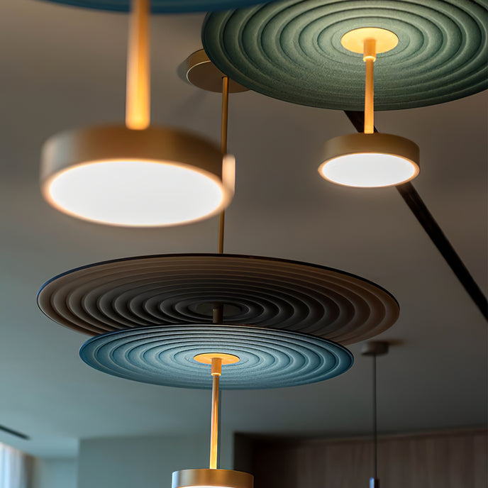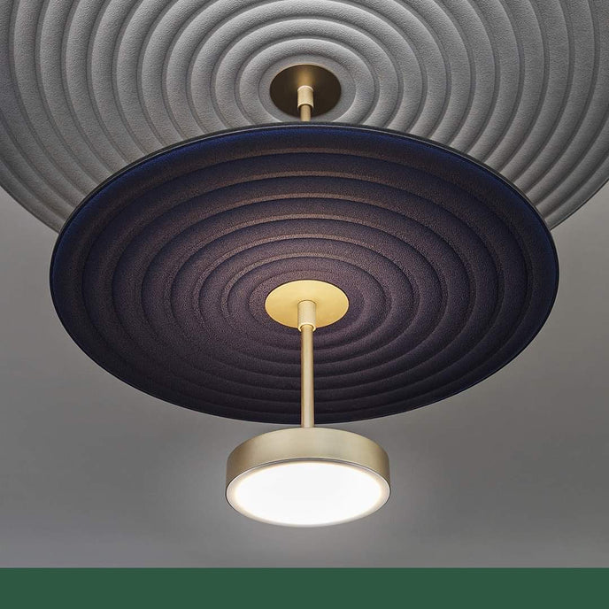 Feel comes from the combination of sound-absorbing textile discs and luminous stems. The colored discs, in matching or contrasting colors, give life to ever-changing configurations, to be suspended from the ceiling, in order to absorb noise and enjoy silence.
