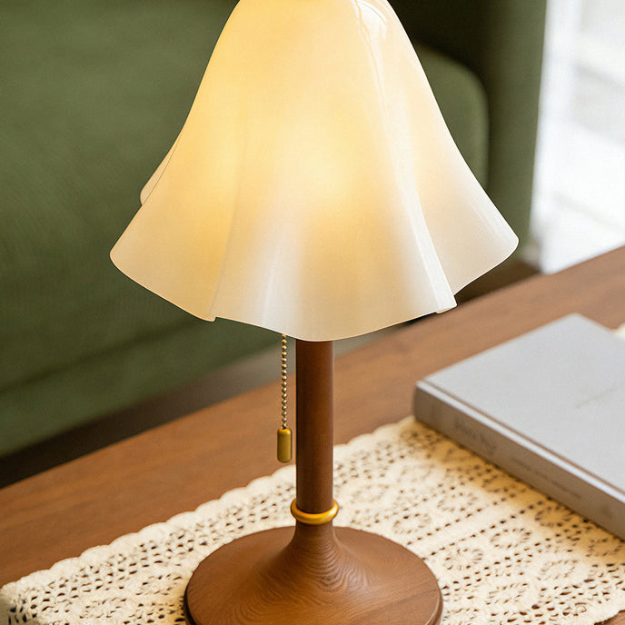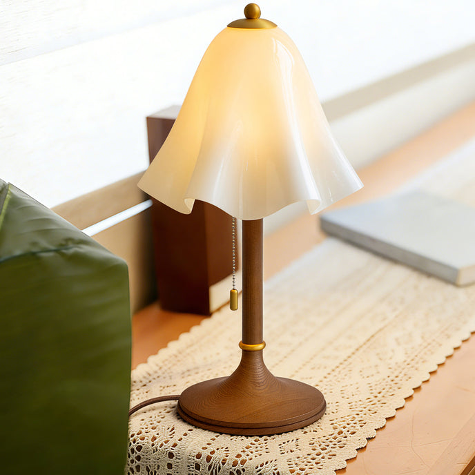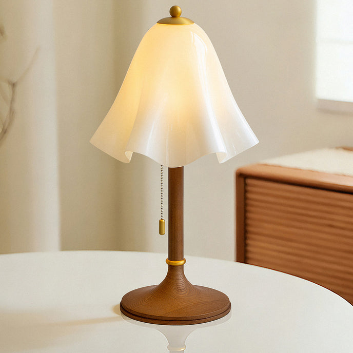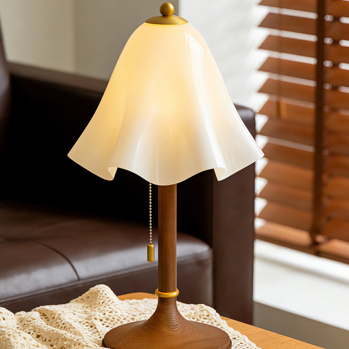 The Glacea Table Lamp by Mooijane combines nostalgic charm with modern elegance. Its bellflower-inspired glass shade transitions from white to beige, suspended from a slender brushed brass stem. The vintage-style zipper switch adds a tactile touch, completing the sophisticated design. Perfect for adding warmth and style to any surface, this lamp enhances bedrooms, living rooms, or side tables with timeless appeal.