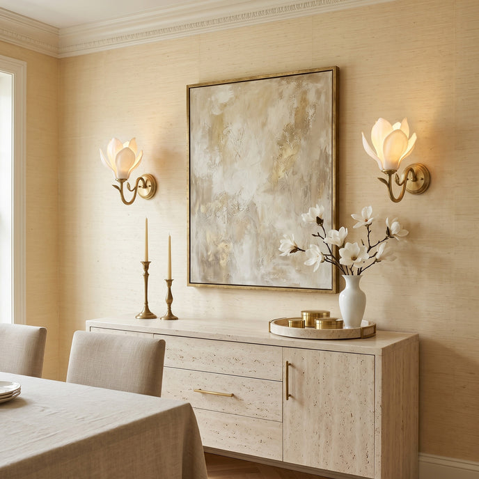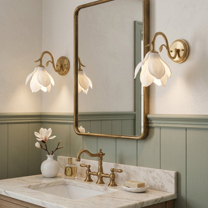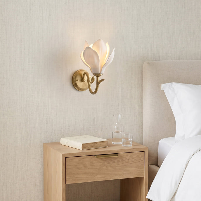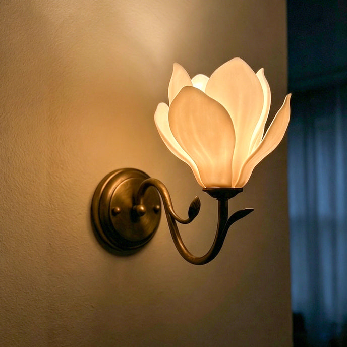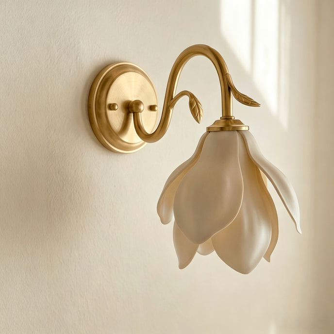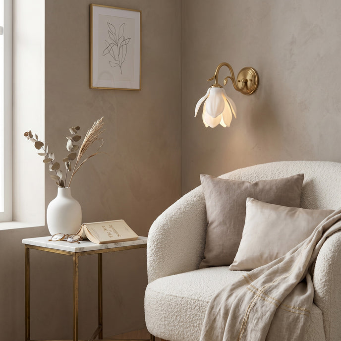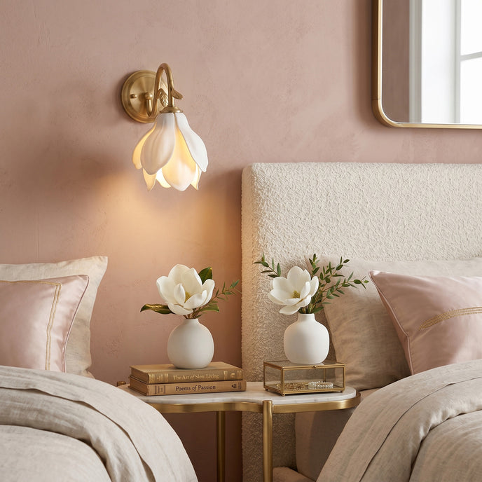 The Liora Bloom Wall Light by Mooijane brings floral elegance and vintage charm to any space. Crafted from iron and ceramic, it features petal-inspired shades, a curved arm, and delicate leaf details for a soft, sculptural look. Perfect for bedrooms, hallways, and cozy living spaces, it adds warm light and romantic character to the room.