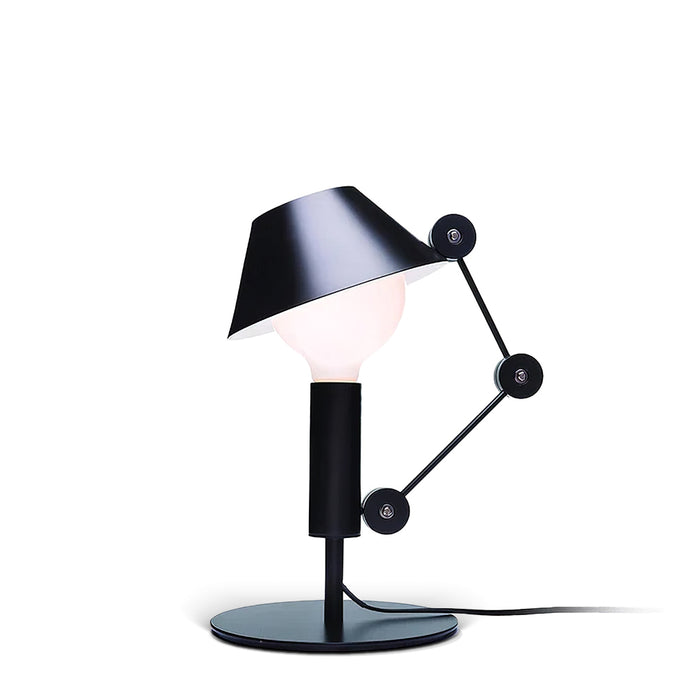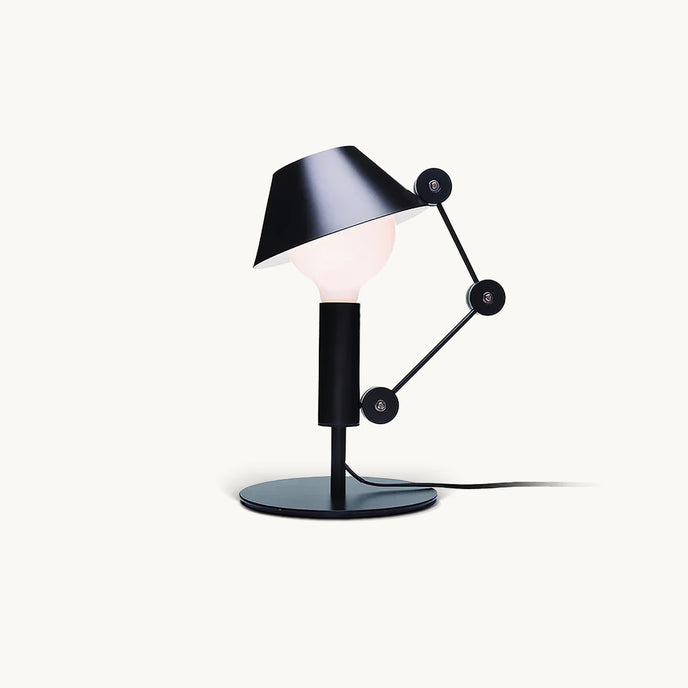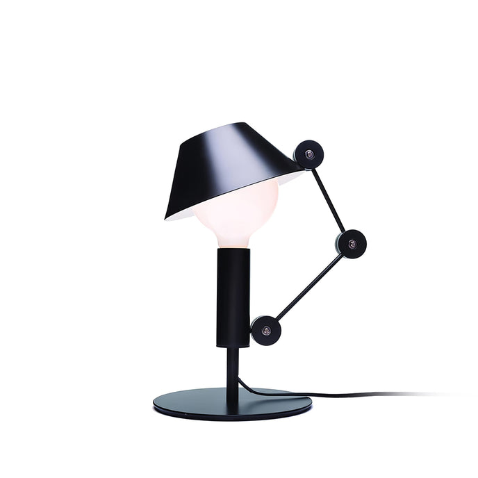 MR. Light Table Lamp est une lampe de table structurée entièrement en métal peint en noir mat. Le bras articulé est équipé de trois articulations qui régulent la mobilité du diffuseur qui protège une source lumineuse avec raccord E27 et câble d'allumage.