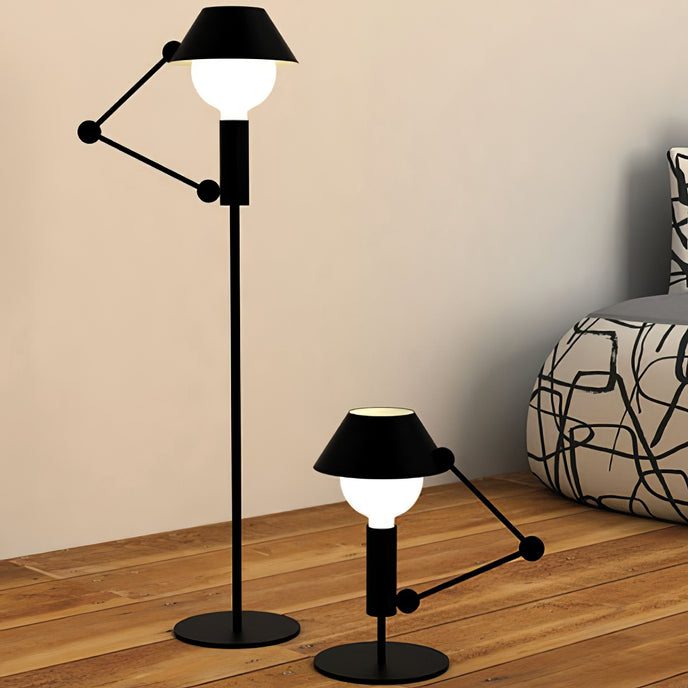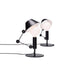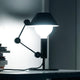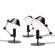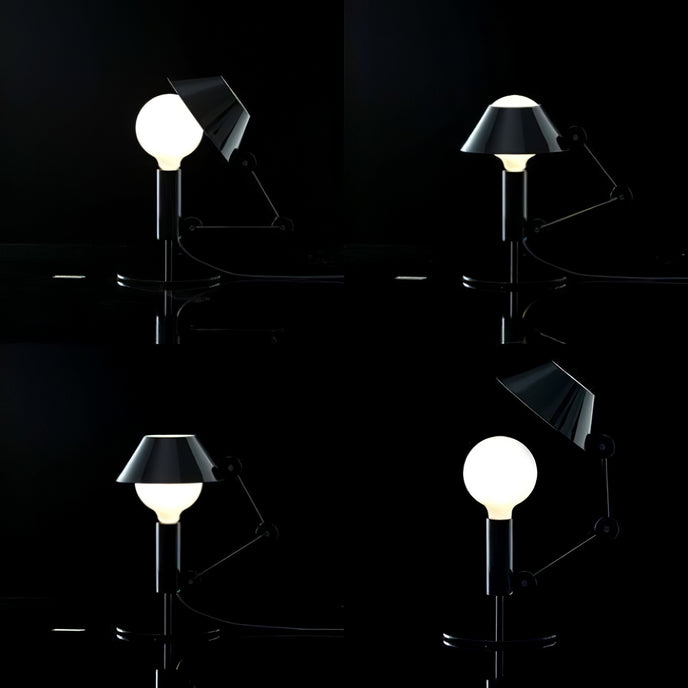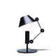 Lampe de table graphique et ludique composée d'un bras articulé et d'un corps en métal noir mat. L'abat-jour bicolore avec intérieur blanc mat crée une lumière diffuse et offre la possibilité de réduire l'intensité de la lumière dans la partie supérieure grâce au couvercle de l'ampoule avec la fermeture du chapeau.
