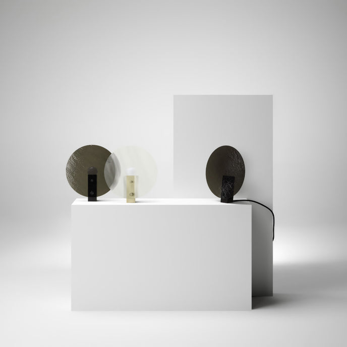 Inspired by the natural phenomena of interstellar clouds and their dynamic layered lighting effects. Named the Nebulae Collection, these fixtures – which include desk lamps – balance geometric machined forms with fluid glass discs. With each fixture, layered glass creates a diffusion of light that highlights the unique variations in textures, ripples, bubbles, incandescents, and geometric patterns.