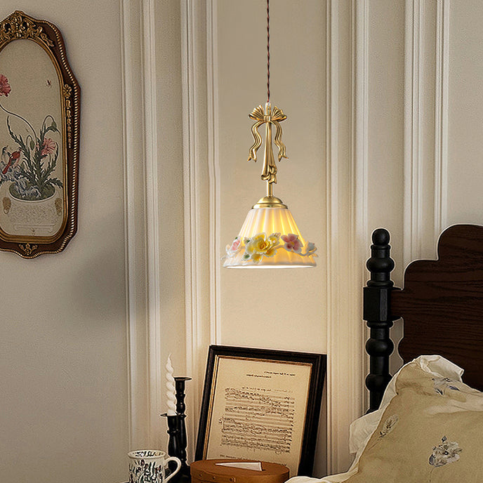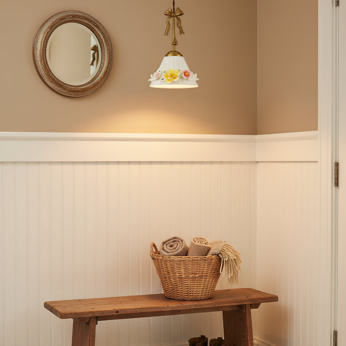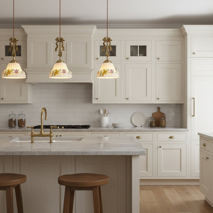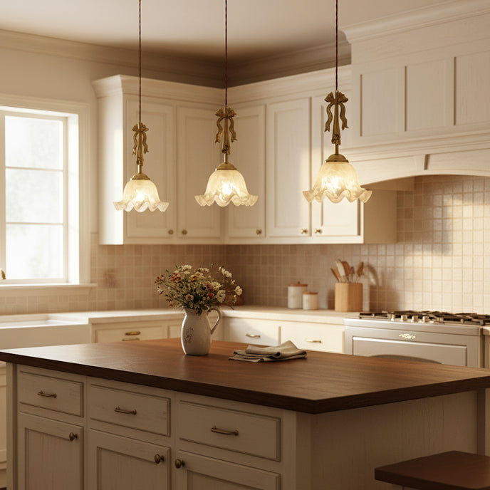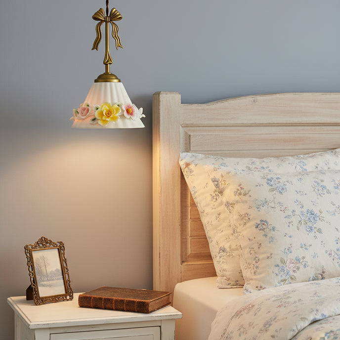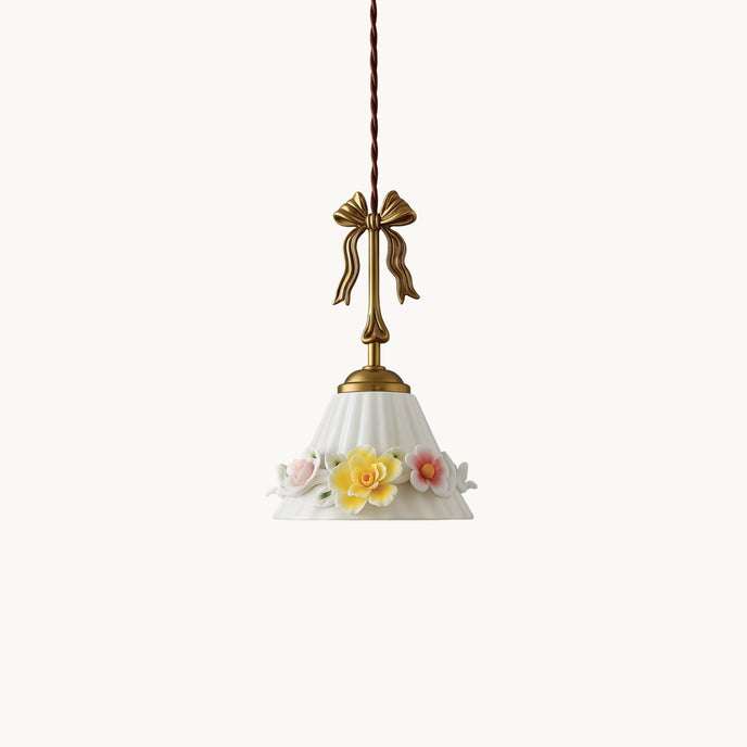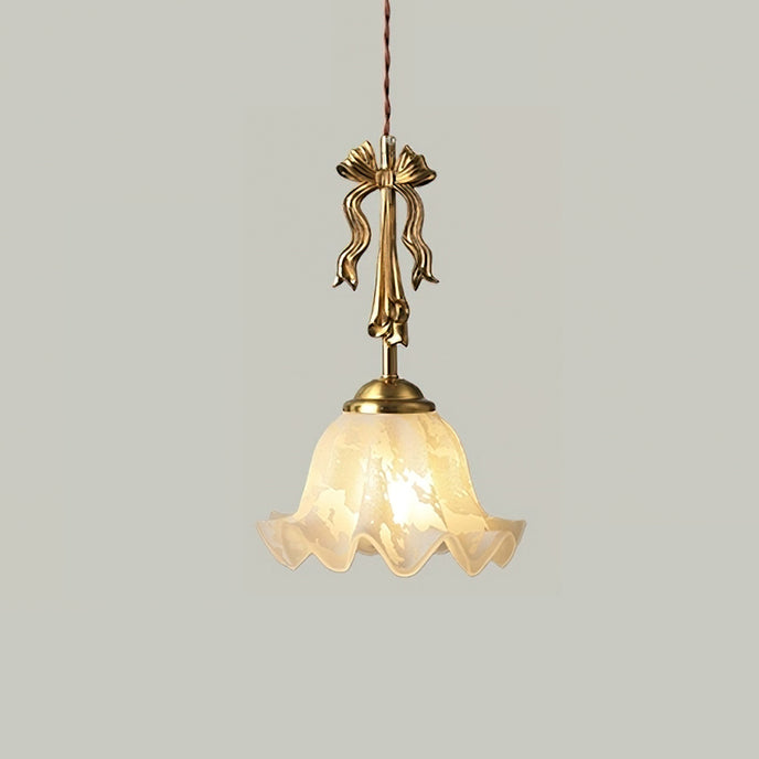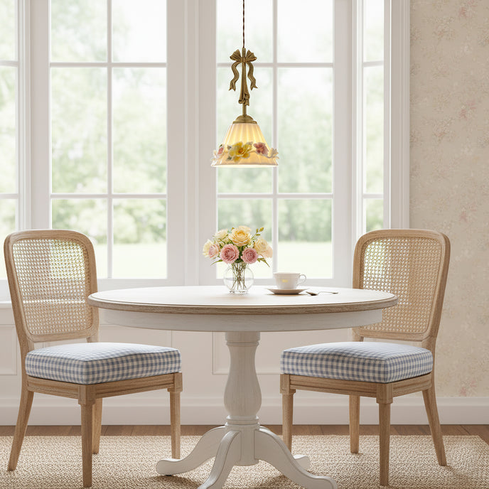 The Neiman Pendant Lamp by Mooijane captures the essence of French romantic elegance with its delicate curves and graceful details. Its wrought iron body features a soft, textured finish accented by a refined bow motif, while the glass shade—adorned with floral reliefs and wavy edges—diffuses light into a gentle, poetic glow. Ideal for bedrooms, dining areas, or cozy reading spaces, this pendant lamp adds timeless charm and understated luxury to any interior.