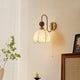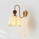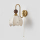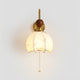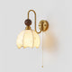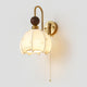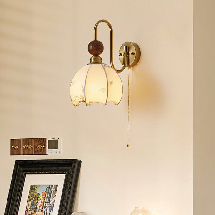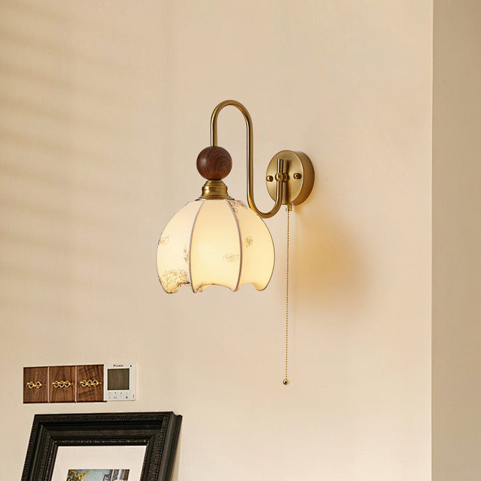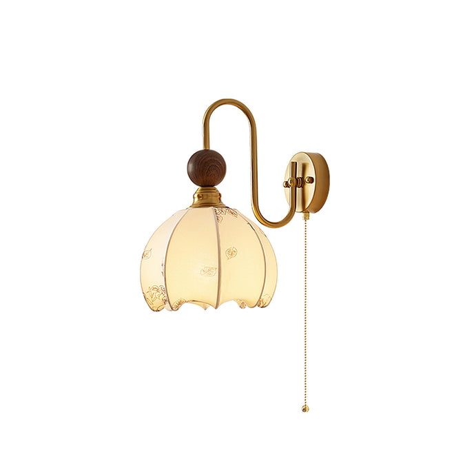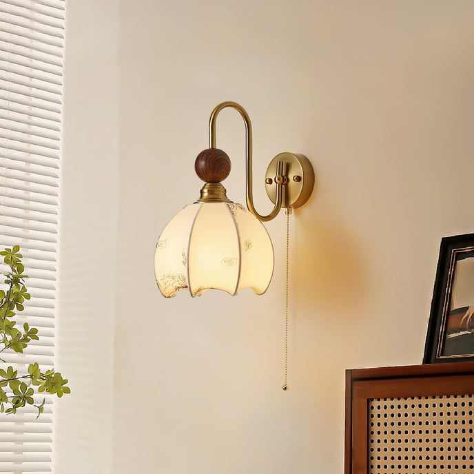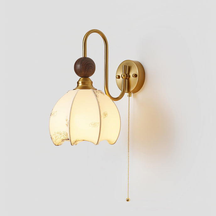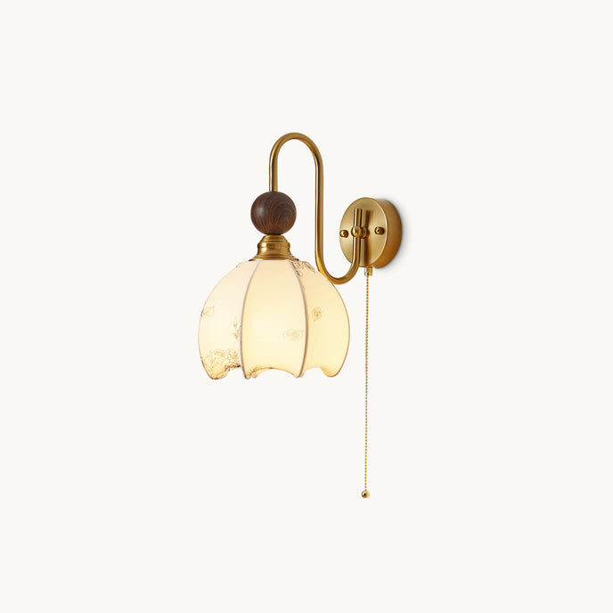 The Nerise Wall Lamp by Mooijane blends retro elegance with warm, natural accents. Its gold metal frame pairs beautifully with solid wood details, creating a refined yet inviting look. The fabric shade, adorned with a delicate leaf pattern, resembles a gently opening flower bud and diffuses a soft, warm glow. A nostalgic pull-chain switch adds both charm and practicality.