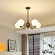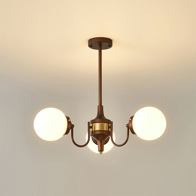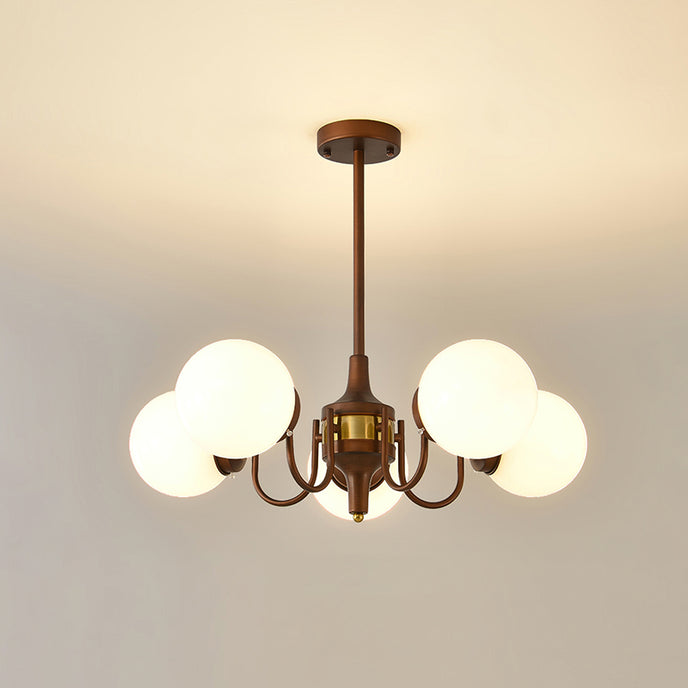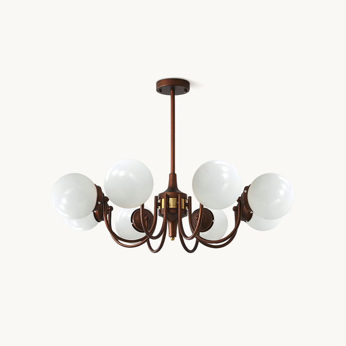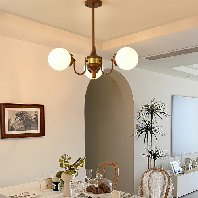 The Orvella Chandelier by Mooijane showcases vintage-inspired elegance with its antique brass wrought iron frame and opaline glass shade. Crafted from high-quality materials, its bronze-painted iron body reflects the charm of classic American mid-century design, while ensuring lasting durability. The opaline glass softly diffuses light, creating a warm, inviting ambiance that enhances dining rooms, living spaces, or entryways with timeless sophistication.