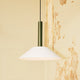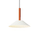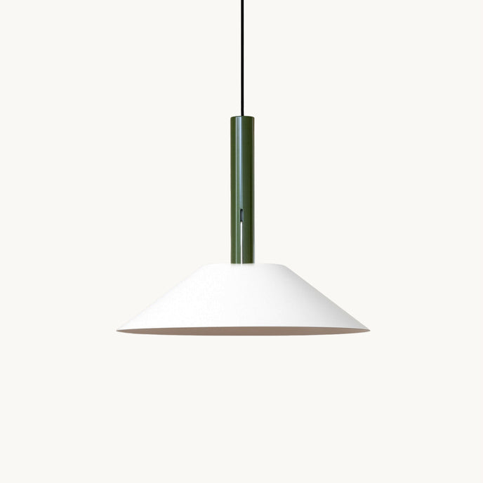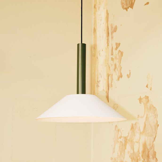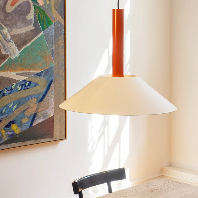 The Pholc Pendant Lamp from Mooijane features a minimalist design with two simple geometric shapes: a wide cone lampshade and a cylindrical socket. Suspended from a single stainless steel hook, the shade appears to float, adding a sleek, modern touch to any space.