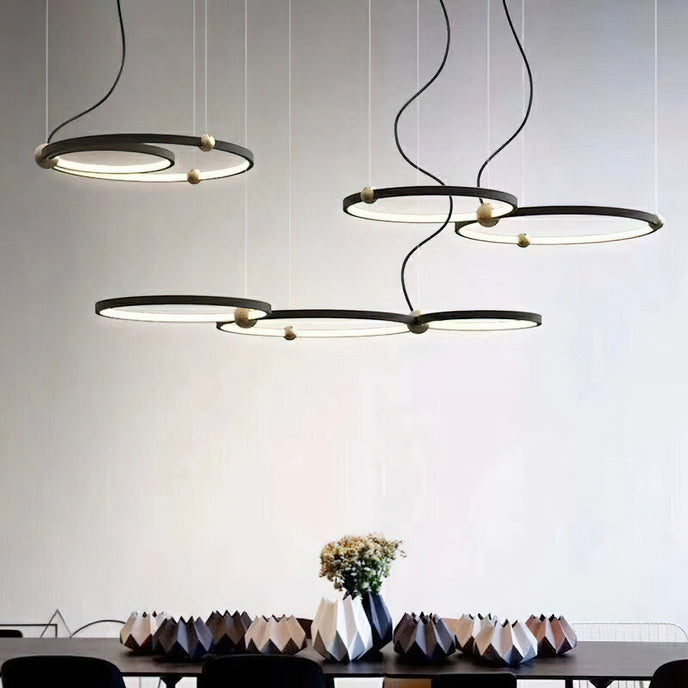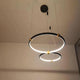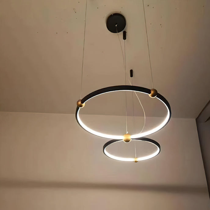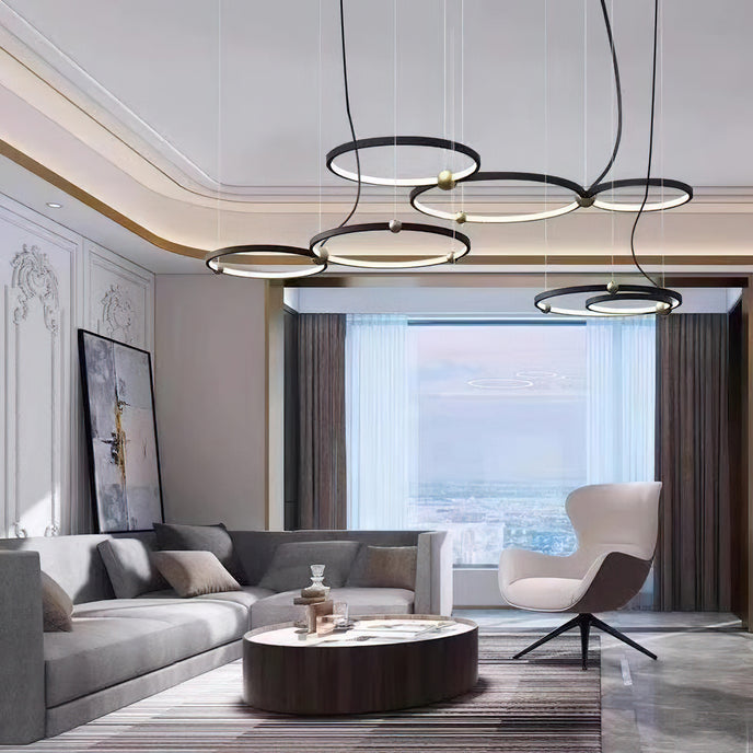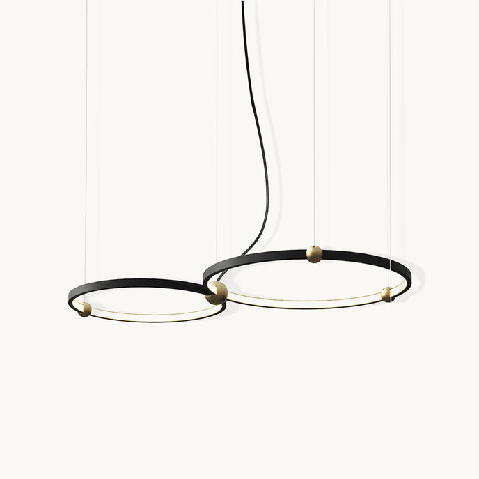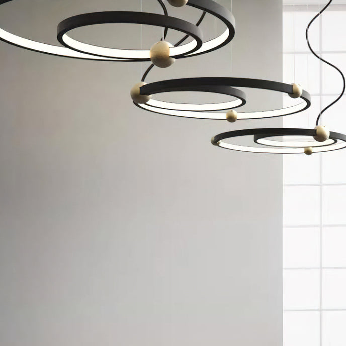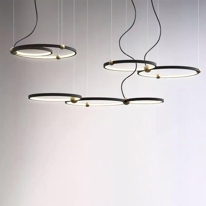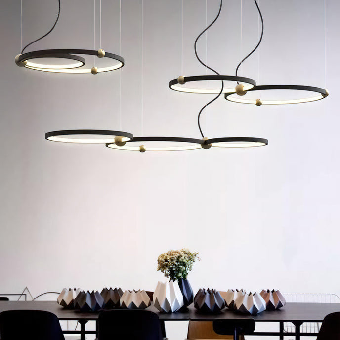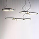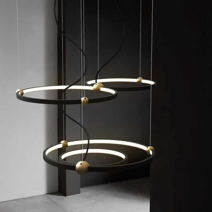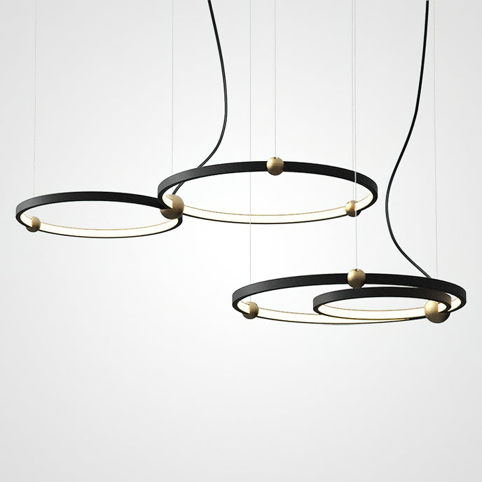 A pendant light or chandelier inspired by the planets that plays with light, shadow and overlapping elements. It consists of several multi-sized rings, made of aluminum and acrylic, with a different visual aesthetic, in a modern minimalist style.