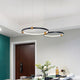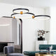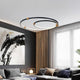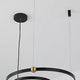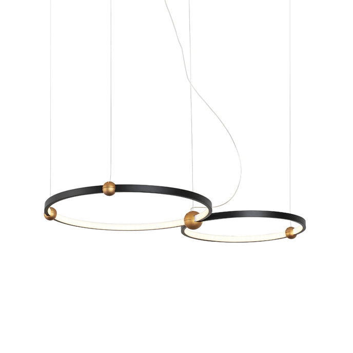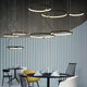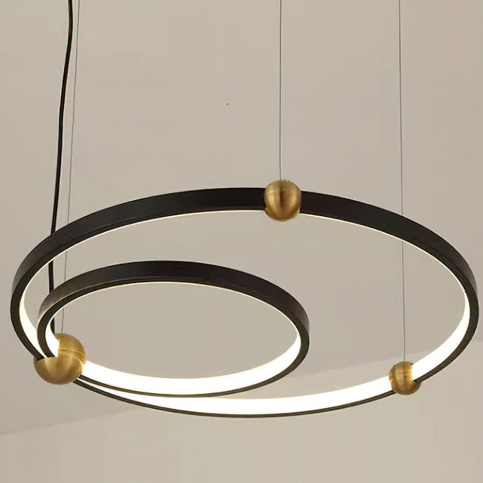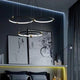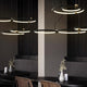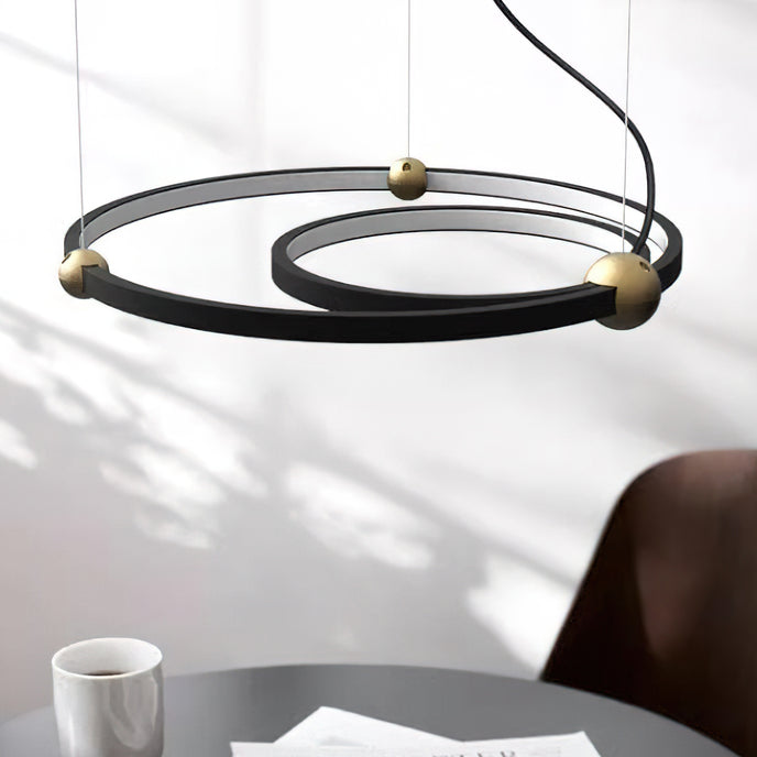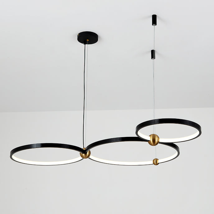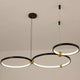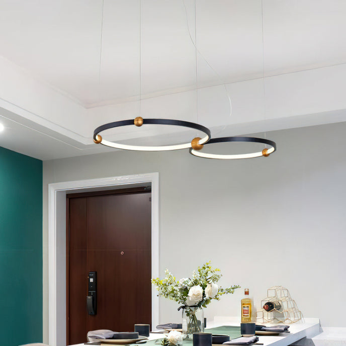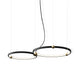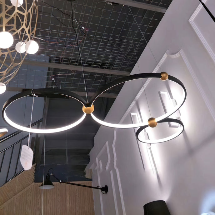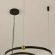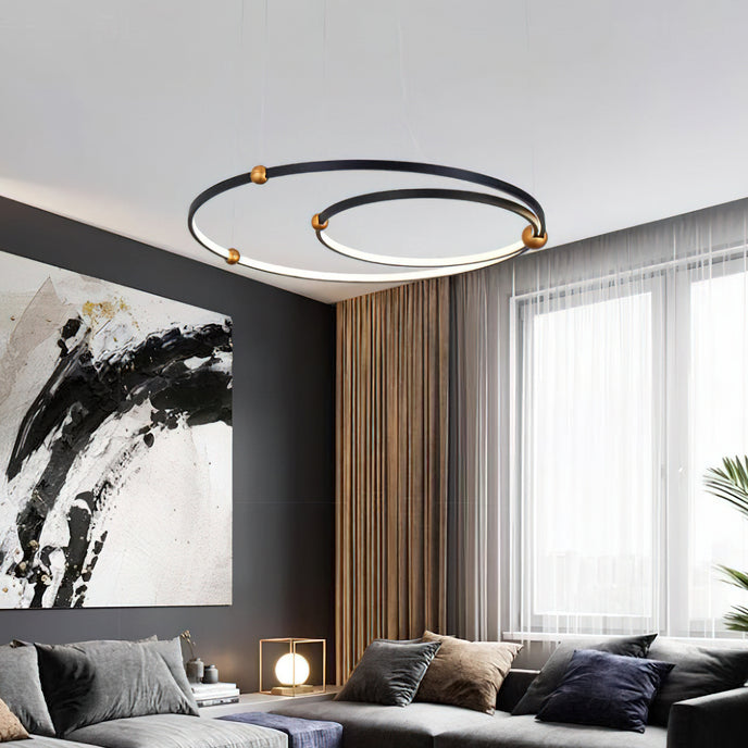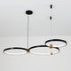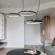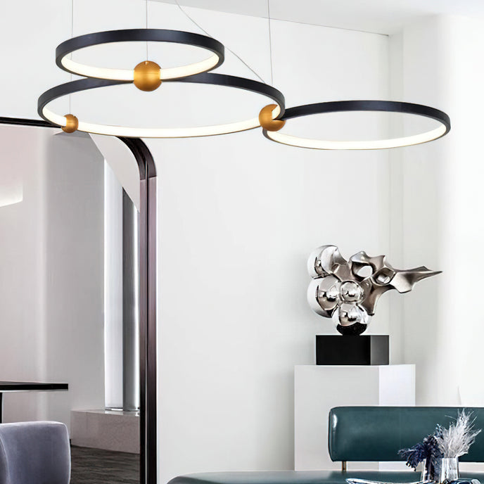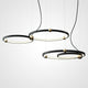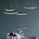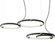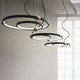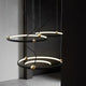 A pendant light or chandelier inspired by the planets that plays with light, shadow and overlapping elements. It consists of several multi-sized rings, made of aluminum and acrylic, with a different visual aesthetic, in a modern minimalist style.