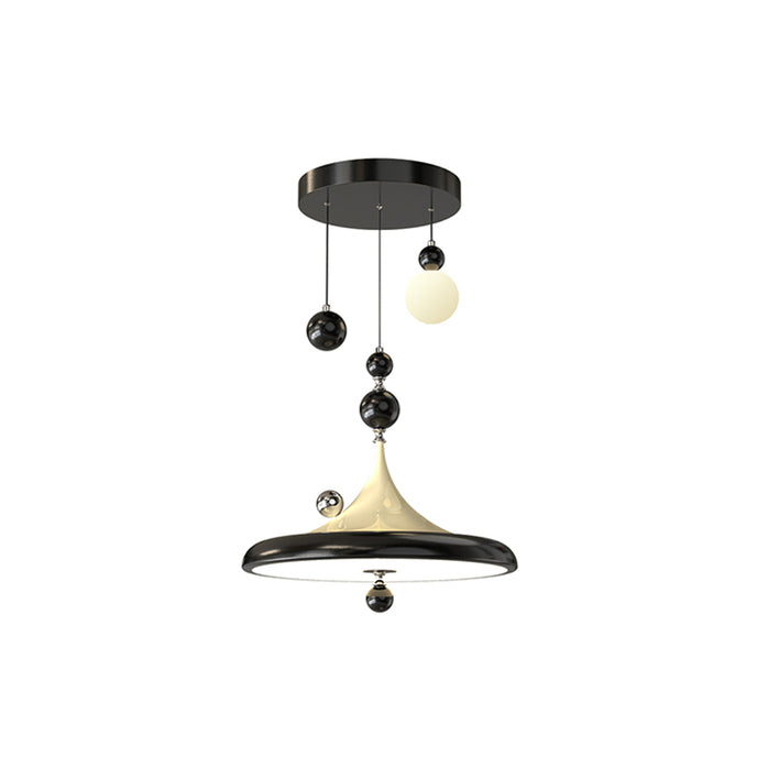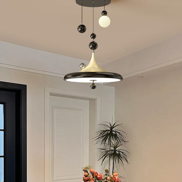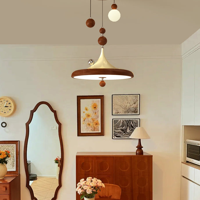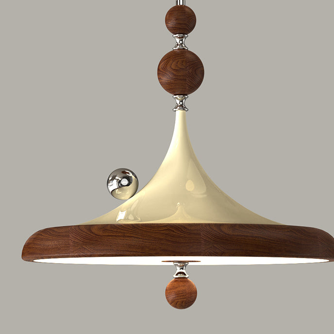 The Prosty Pendant Lamp by Mooijane is a refined blend of modern minimalism and vintage elegance. Featuring a sleek metal frame in water transfer wood grain or glossy black finishes, it offers both warmth and sophistication. The wide conical shade casts a soft, ambient glow, making it ideal for dining areas, living rooms, or entryways. Sculptural balancing spheres add a distinctive touch, turning this pendant into a subtle statement piece for any interior.