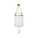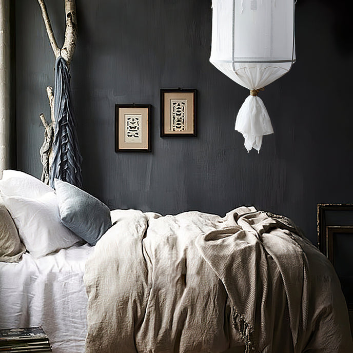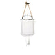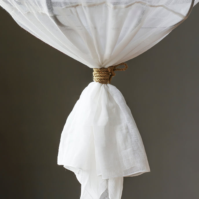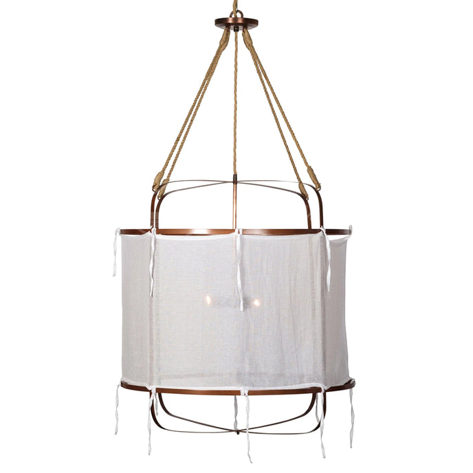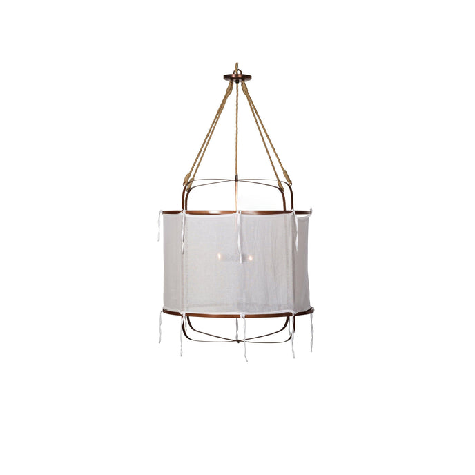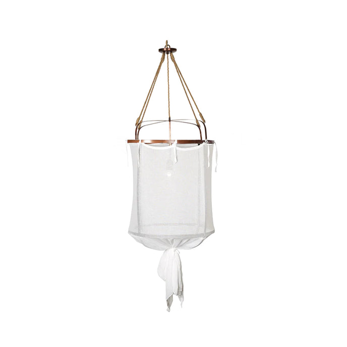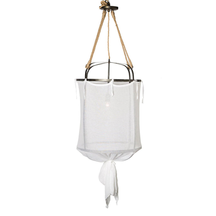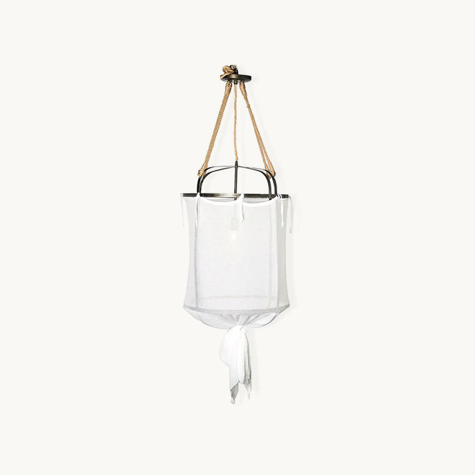 Un tonneau en fer vieilli est enveloppé de lin belge transparent pour créer une lumière classique et décontractée. Le pendentif Provence est suspendu par une corde en lin marron qui cache uniquement les composants électriques.