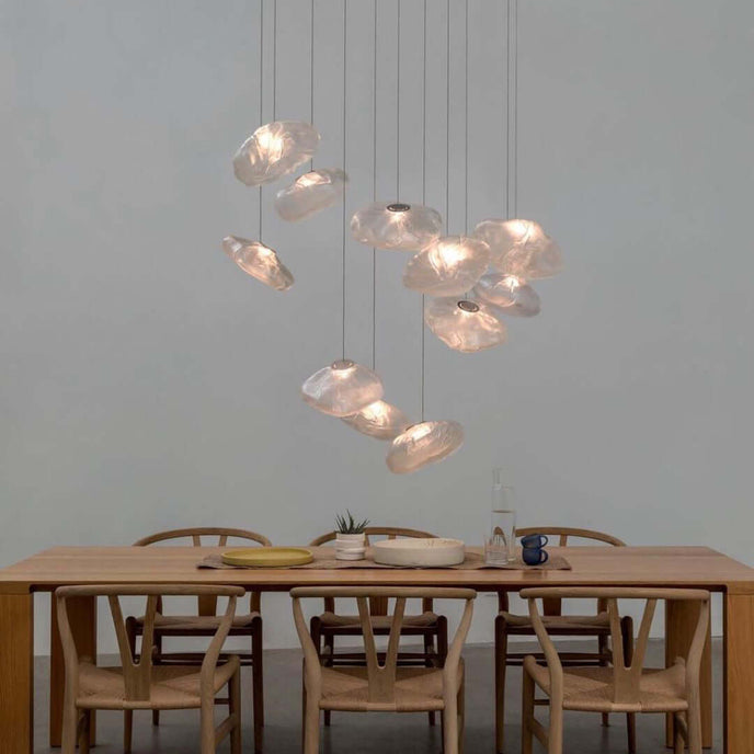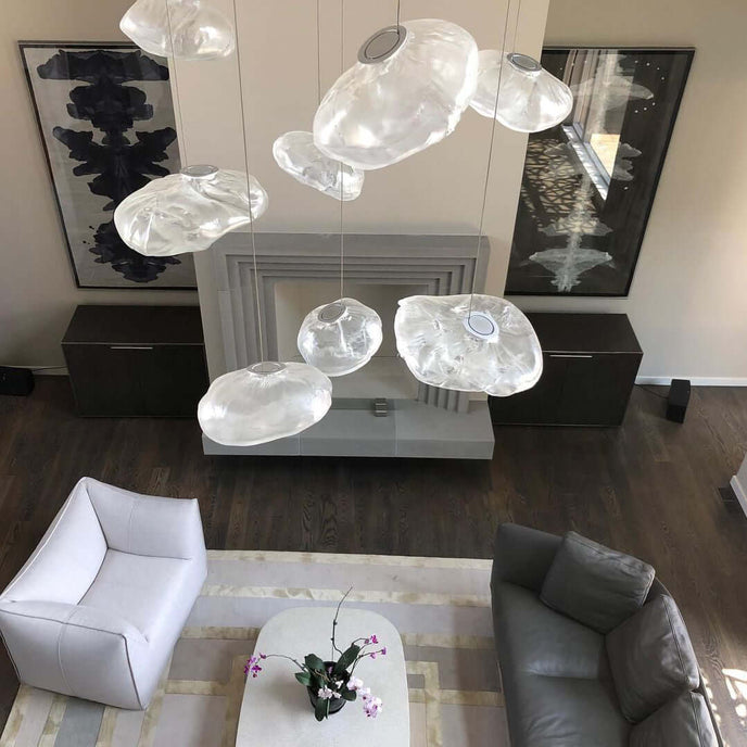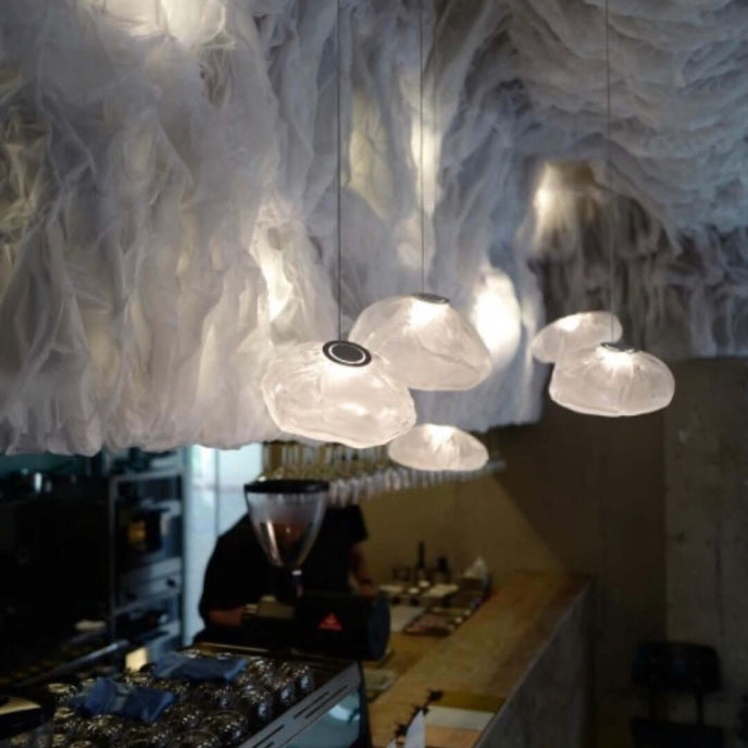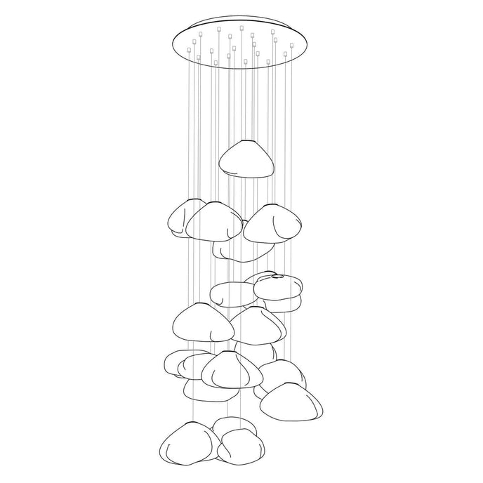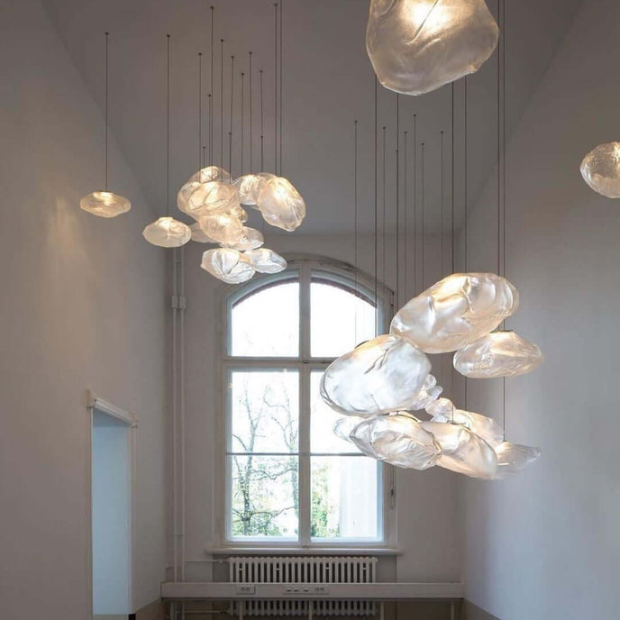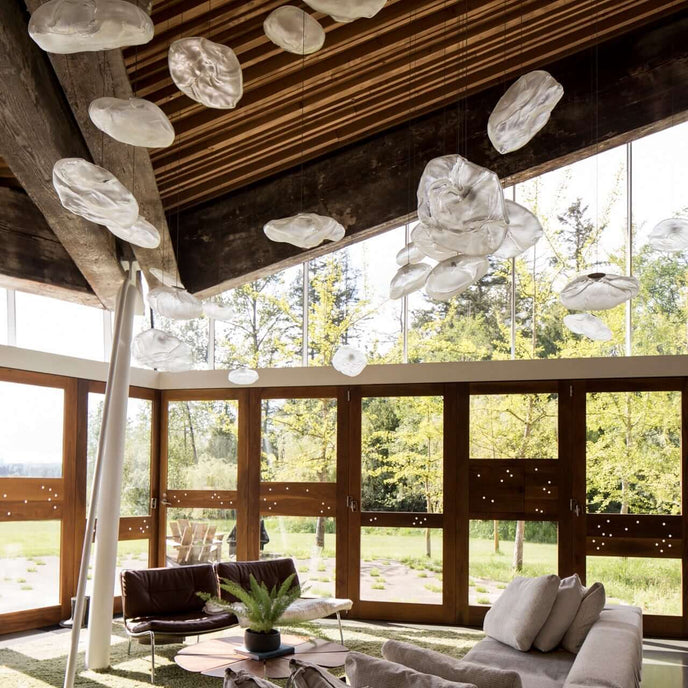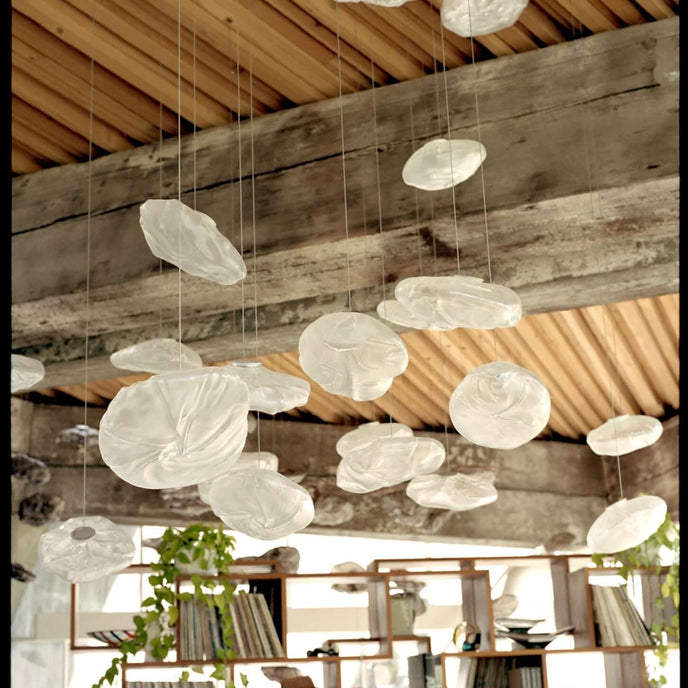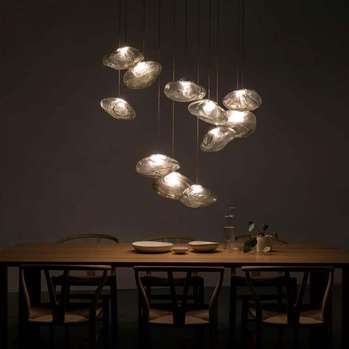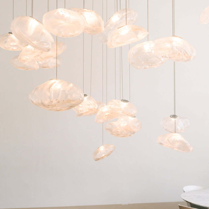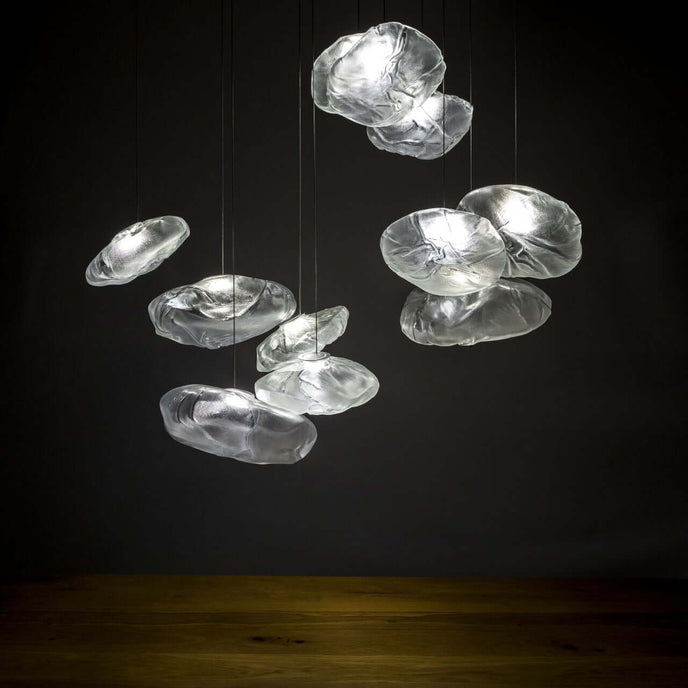 73.1 est une suspension basse tension conçue pour être composée dans des configurations atmosphériques. Chaque pendentif est soufflé à la bouche dans un récipient en tissu céramique plié et hautement résistant à la chaleur.