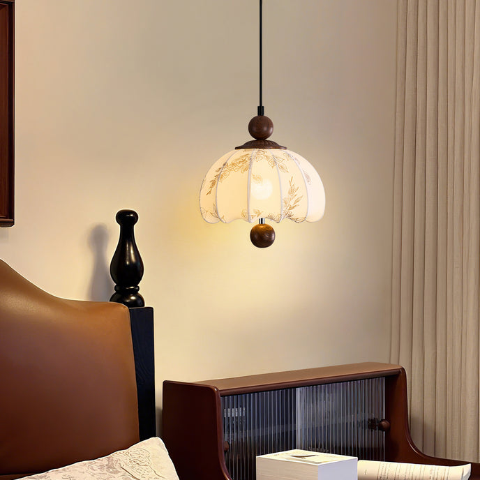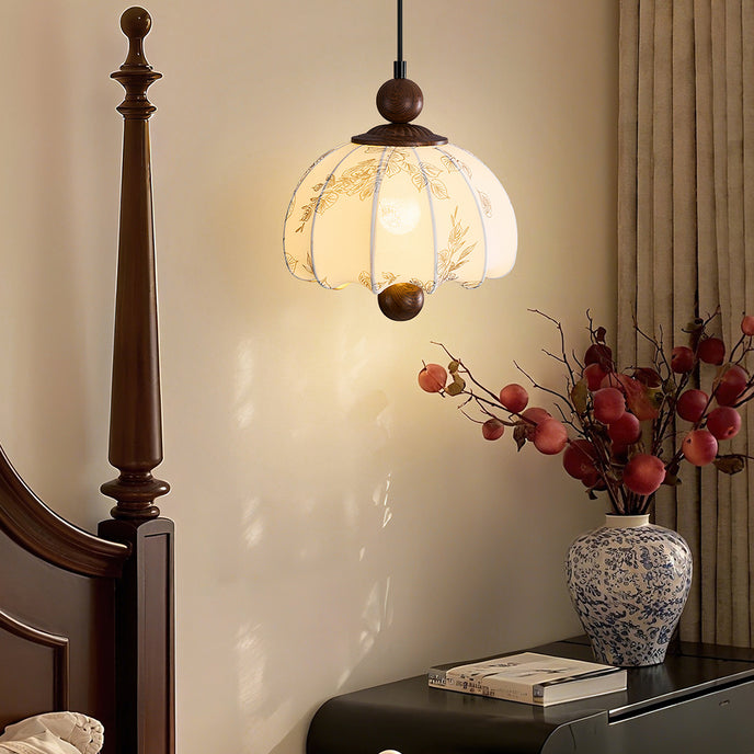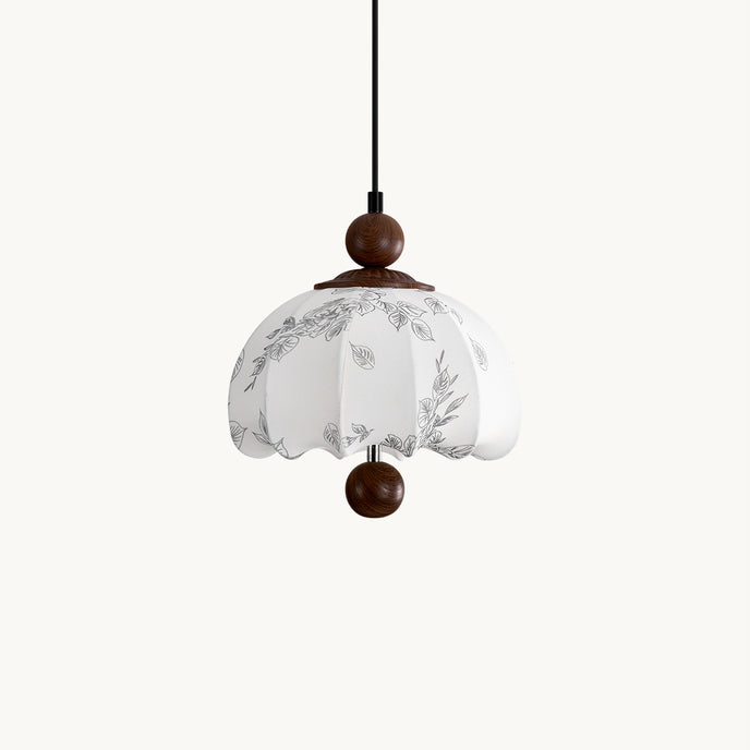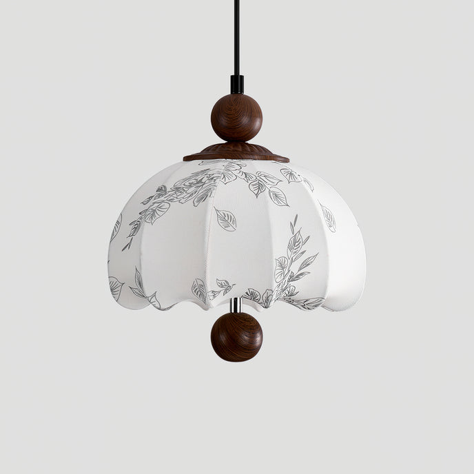 The Solenne Pendant Lamp by Mooijane combines natural warmth with artistic detail. Its fabric shade, adorned with delicate botanical patterns, evokes the elegance of a blooming umbrella, diffusing light into a soft and inviting glow. Accented with wooden spheres above and below, the design strikes a harmonious balance between vintage charm and organic simplicity.