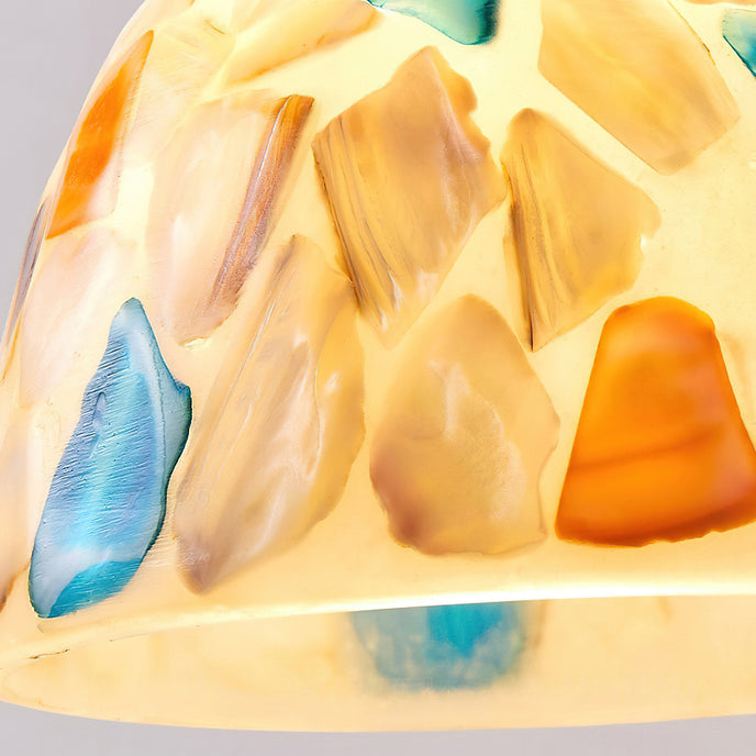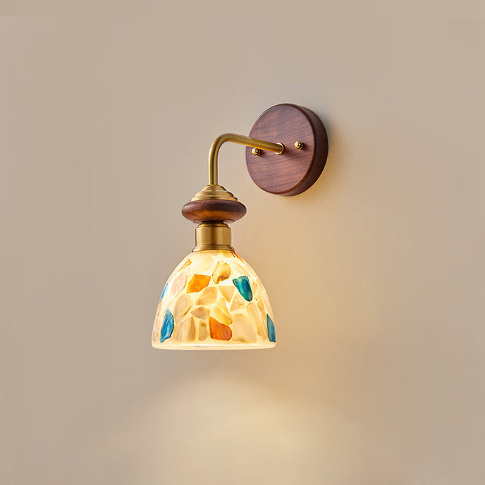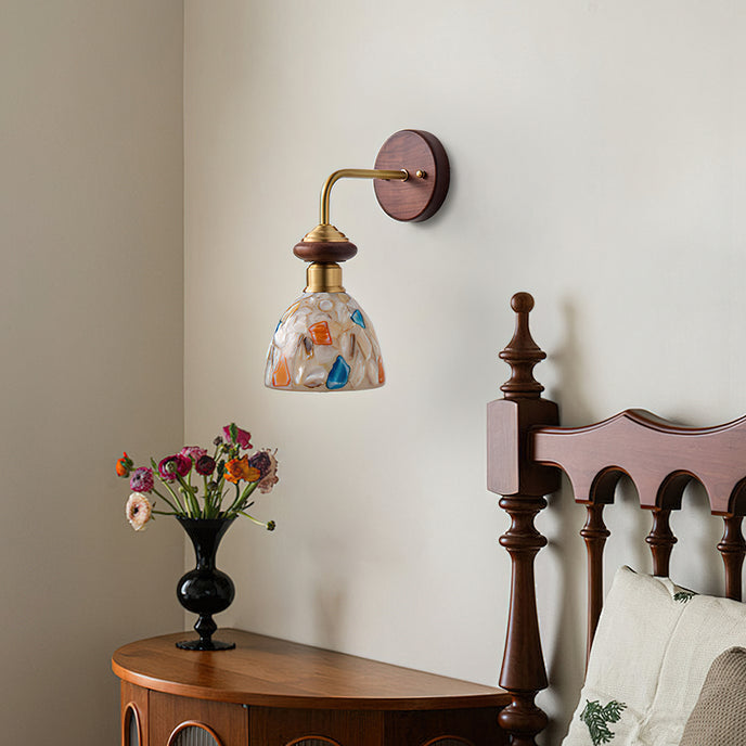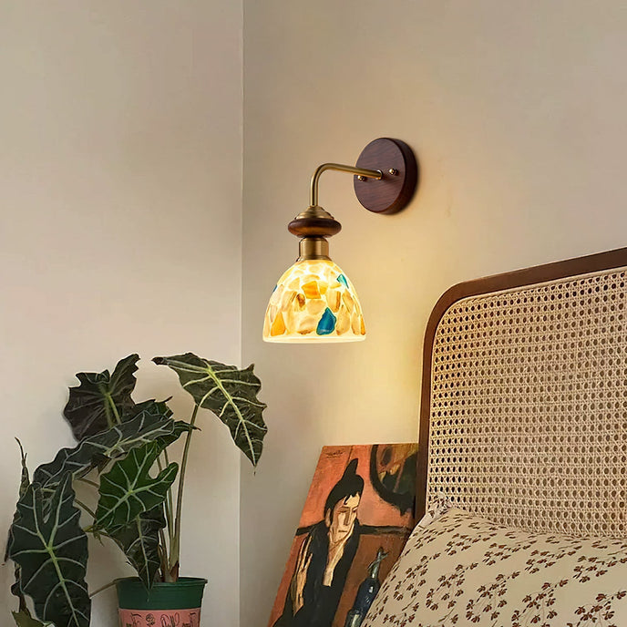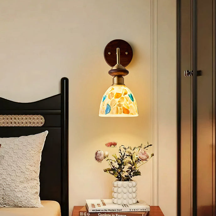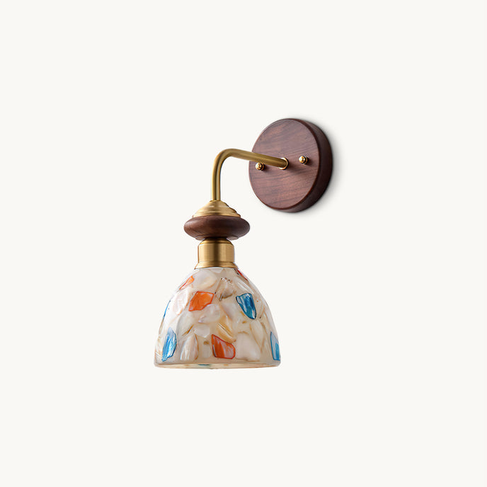 The Tivora Wall Lamp by Mooijane features an elegant curved form that brings warmth and artistry to any space. Its handcrafted shade is inlaid with irregular, colorful shell fragments, casting a shimmering, glass-like glow when illuminated. A matte gold arm contrasts beautifully with the dark wood base, adding depth and sophistication. Ideal for bedside lighting, entryways, or staircases, Tivora offers a vibrant blend of texture, color, and timeless design.