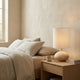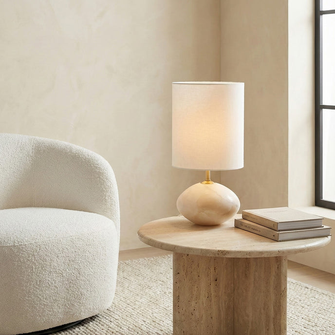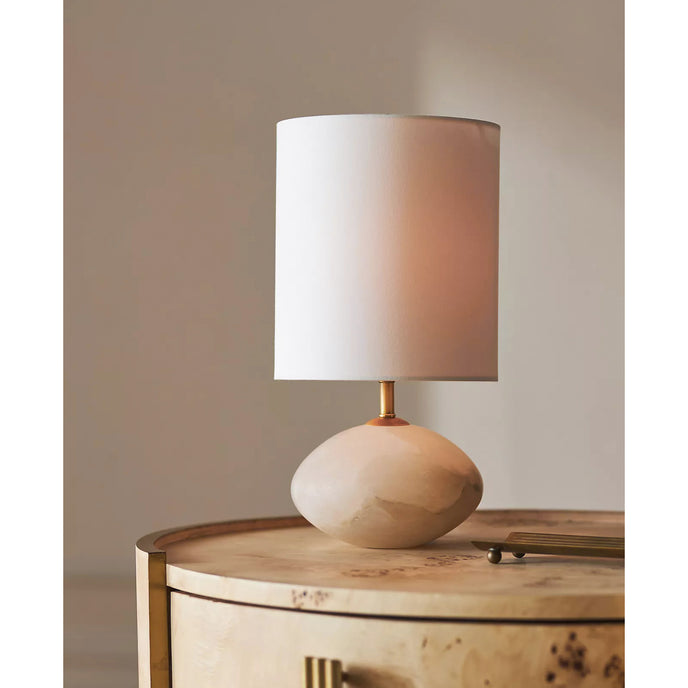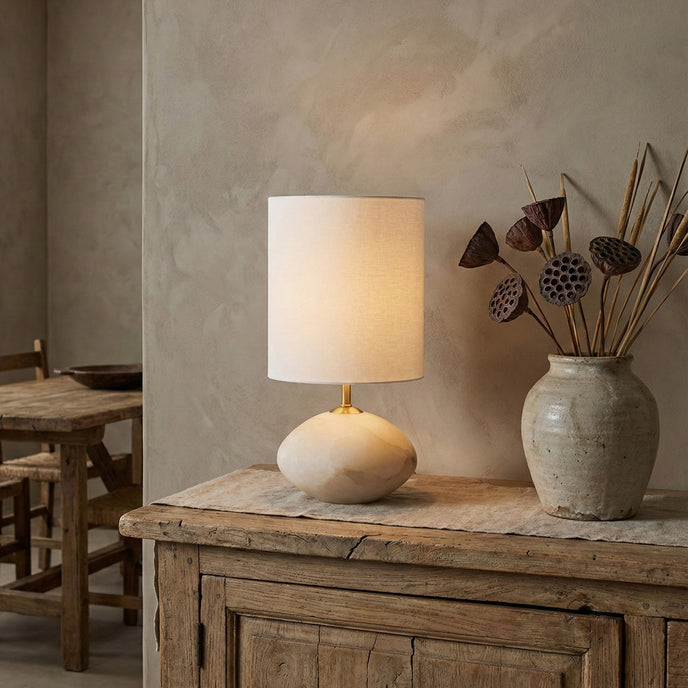 The Vaneta Table Lamp by Mooijane pairs a softly rounded natural stone base with a crisp fabric shade for a calm, understated presence. Its organic silhouette and warm, diffused glow add quiet elegance to bedside tables, living rooms, and reading corners.