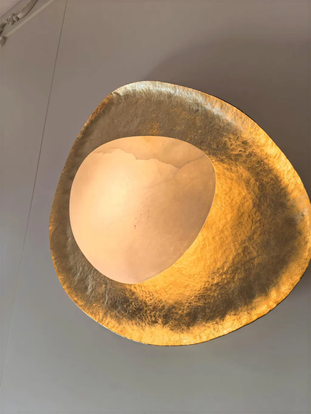 Bring sculptural warmth to your walls with the Achille Wall Lamp by Mooijane. A hand-hammered brass plate with a softly irregular silhouette reflects a golden glow, while the central alabaster-like diffuser casts gentle, ambient light. Equal parts lighting and art, Achille adds depth and sophistication to hallways, bedrooms, and living spaces.