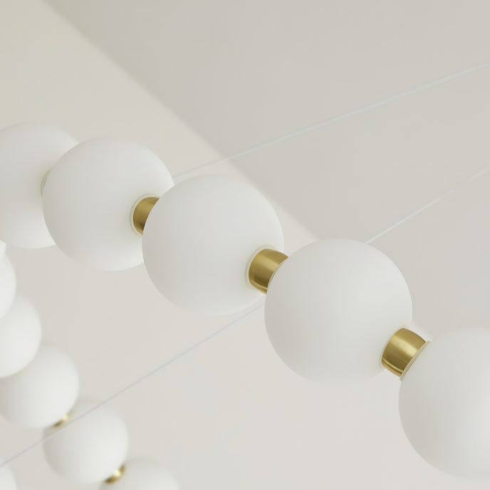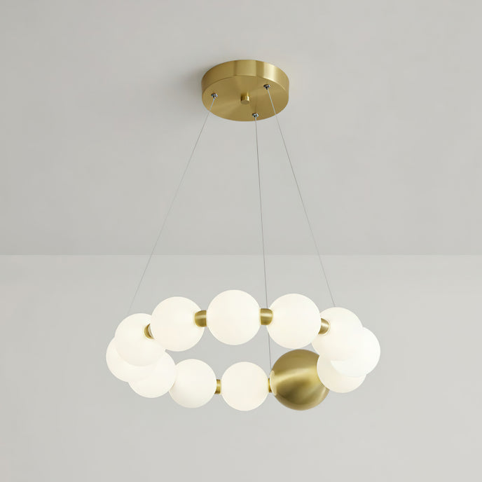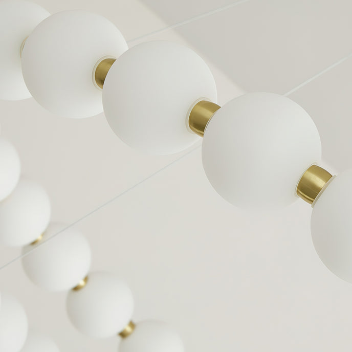 Upgrade your home with our Aeyee Pearls Chandelier from Mooijane. Featuring a brass base and white plastic globes, this elegant chandelier adds a touch of sophistication to any room. The versatile design and warm light make it the perfect centerpiece for gatherings and quality family time.